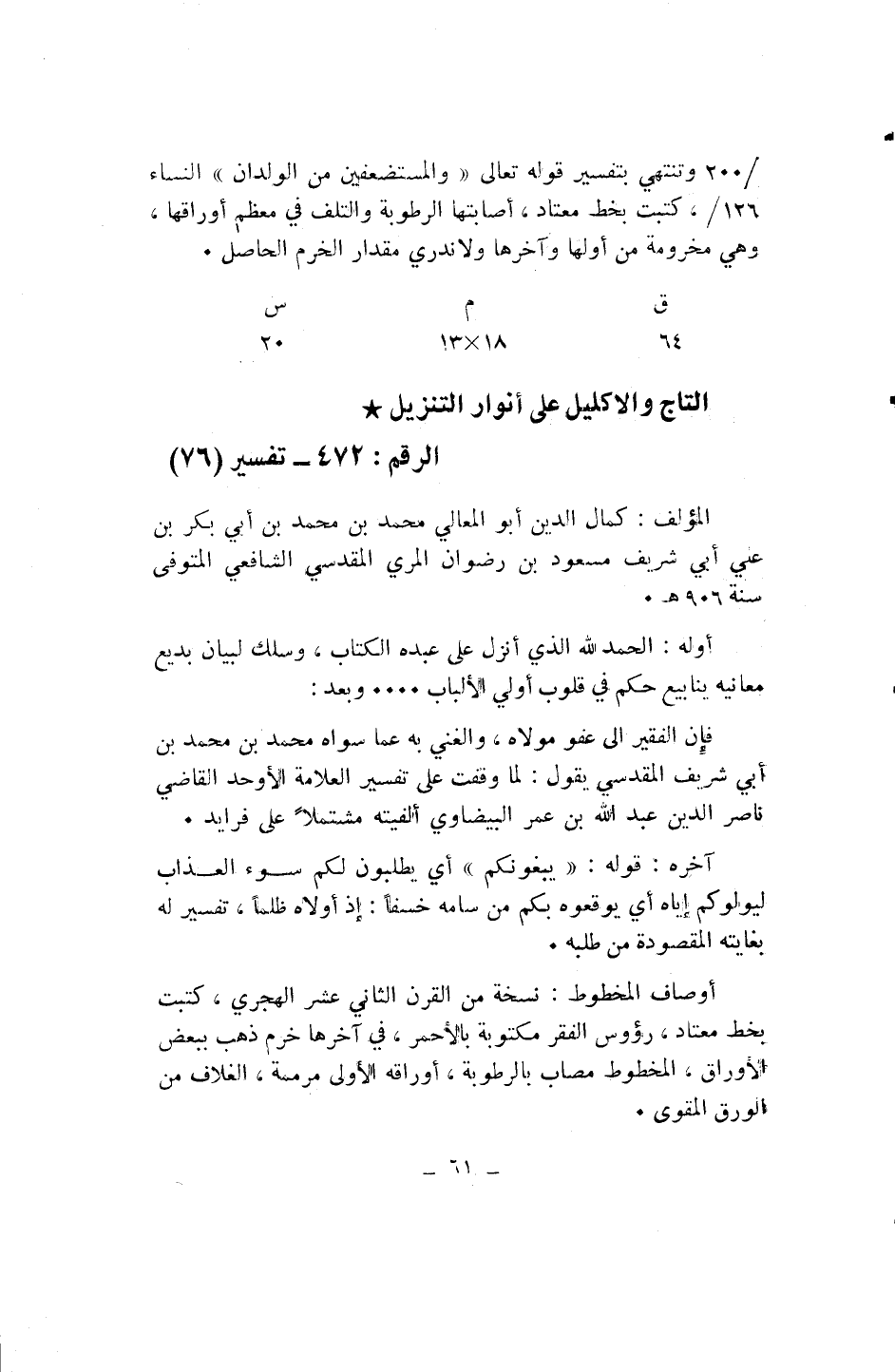 التاج والاكليل على أنوار التنزيل* الرقم: 472 - تفسير (76)