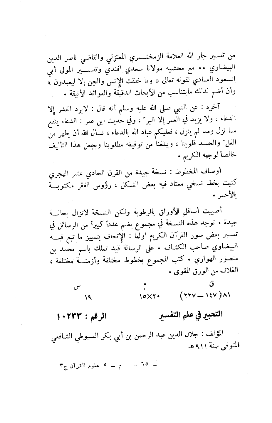 من تفسير جار الله العلامة الزمخشري المعتزلي والقاضي ناصر الدين البيضاوي .. مع محشيه مولانا سعدي أفندي وتفسير المولى أبي السعود العمادي لقوله تعالى «وَما خَلَقْتُ الْجِنَّ وَالْإِنْسَ إِلَّا لِيَعْبُدُونِ» وأن أضم لذلك ما يتناسب من الأبحاث الدقيقة والفوائد الأنيقة.