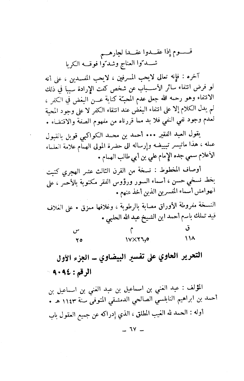 يقول العبد الفقير ... أحمد بن محمد الكواكبي قوبل بالقبول عمله، هذا ما تيسر تبييضه وإرساله الى حضرة المولى الهمام علامة العلماء الأعلام سمي جده الإمام علي بن أبي طالب الهمام.