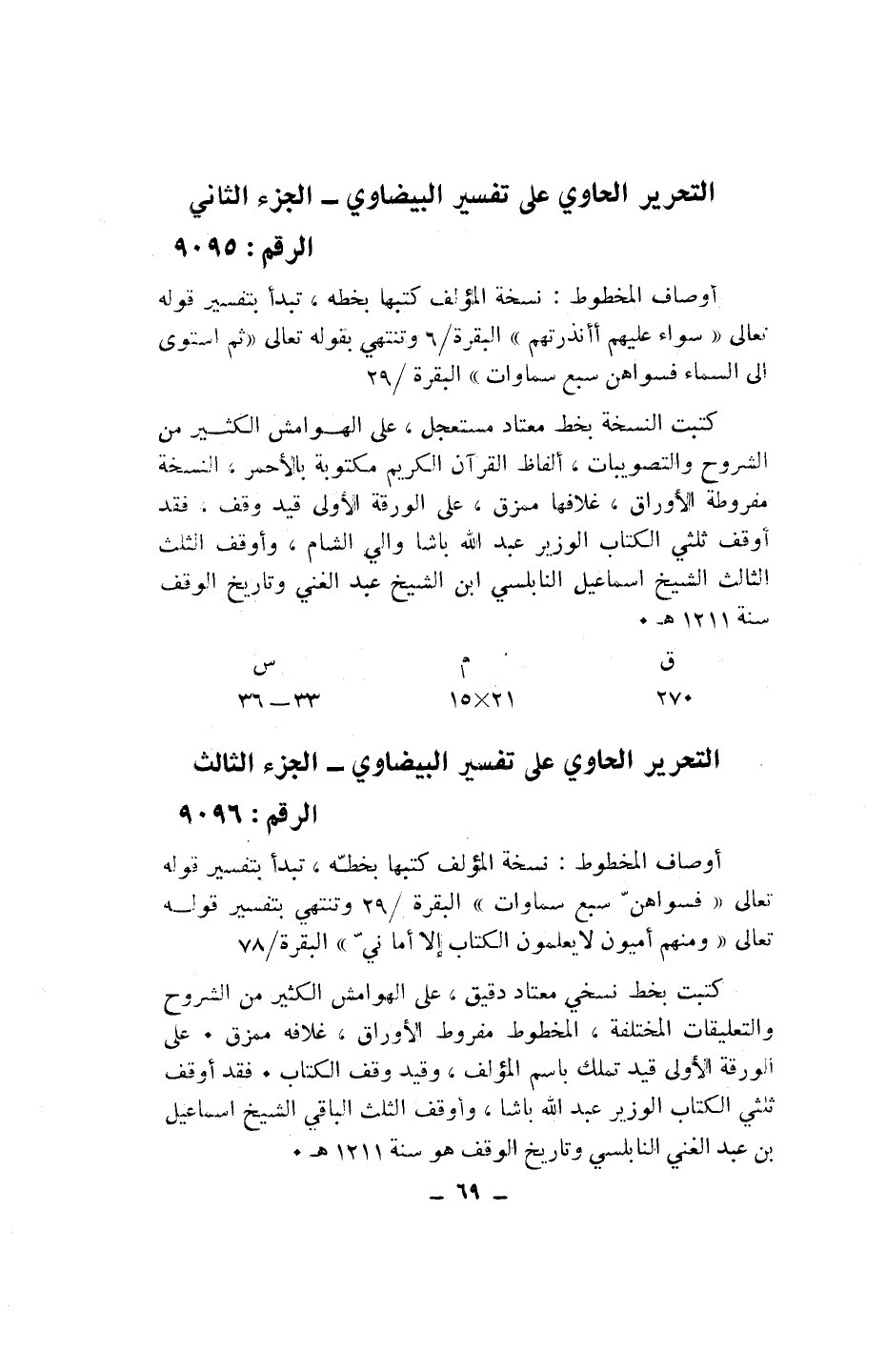 أوصاف المخطوط: نسخة المؤلف كتبها بخطّه، تبدأ بتفسير قوله تعالى «فَسَوَّاهُنَّ سَبْعَ سَماواتٍ» البقرة/ 29 وتنتهي بتفسير قوله تعالى «وَمِنْهُمْ أُمِّيُّونَ لا يَعْلَمُونَ الْكِتابَ إِلَّا أَمانِيَّ» البقرة/ 78 كتبت بخط نسخي معتاد دقيق، على الهوامش الكثير من الشروح والتعليقات المختلفة، المخطوط مفروط الأوراق، غلافه ممزق. على الورقة الأولى قيد تملك باسم المؤلف، وقيد وقف الكتاب. فقد أوقف ثلثي الكتاب الوزير عبد الله باشا، وأوقف الثلث الباقي الشيخ اسماعيل بن عبد الغني النابلسي وتاريخ الوقف هو سنة 1211 هـ.