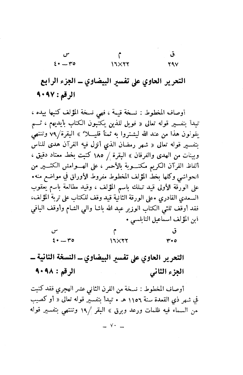 أوصاف المخطوط: نسخة قيمة، فهي نسخة المؤلف كتبها بيده، تبدأ بتفسير قوله تعالى «فَوَيْلٌ لِلَّذِينَ يَكْتُبُونَ الْكِتابَ بِأَيْدِيهِمْ، ثُمَّ يَقُولُونَ هذا مِنْ عِنْدِ اللَّهِ لِيَشْتَرُوا بِهِ ثَمَناً قَلِيلًا» البقرة/ 79 وتنتهي بتفسير قوله تعالى «شَهْرُ رَمَضانَ الَّذِي أُنْزِلَ فِيهِ الْقُرْآنُ هُدىً لِلنَّاسِ وَبَيِّناتٍ مِنَ الْهُدى وَالْفُرْقانِ» البقرة/ 185 كتبت بخط معتاد دقيق، ألفاظ القرآن الكريم مكتوبة بالأحمر، على الهوامش الكثير من الحواشي وكلها بخط المؤلف المخطوط مفروط الأوراق في مواضع منه.