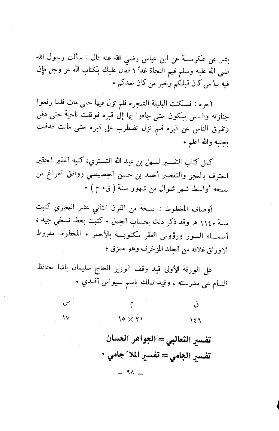 كمل كتاب التفسير لسهل بن عبد الله التستري، كتبه الفقير الحقير المعترف بالعجز والتقصير أحمد بن حسن الجصيصي ووافق الفراغ من نسخه أواسط شهر شوال من شهور سنة (ق. م).