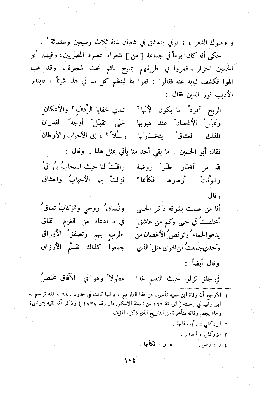 (1) الأرجح أن وفاة ابن سعيد تأخرت عن هذا التاريخ، وإنها كانت في حدود 685، فقد ترجم له ابن رشيد في رحلته (الورقة 169 من نسخة الاسكوريال رقم 1737) وذكر أنه لقب بتونس؛ وهذا يجعل وفاته متأخرة عن التاريخ الذي ذكره المؤلف.