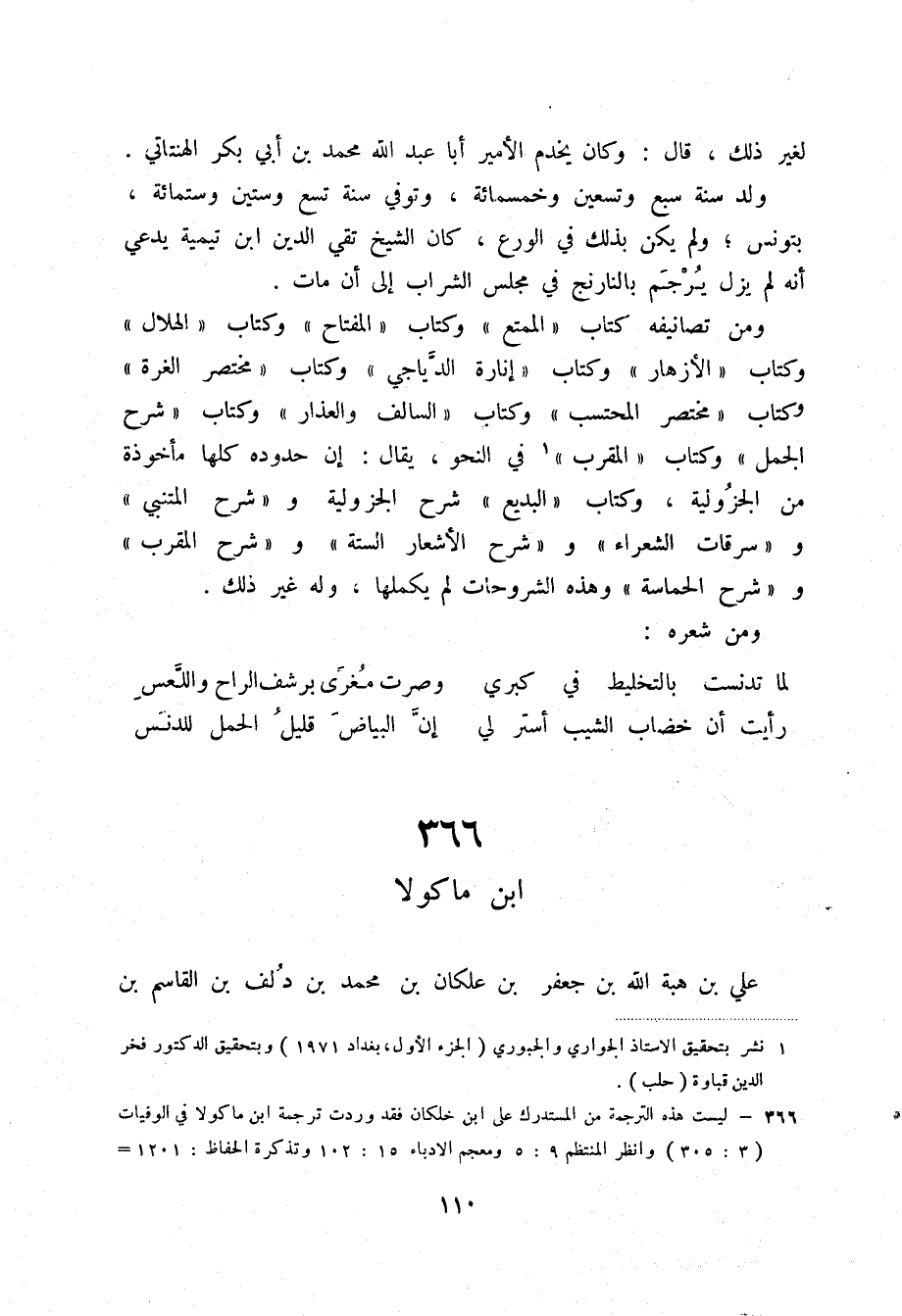 (2) ليست هذه الترجمة من المستدرك على ابن خلكان فقد وردت ترجمة ابن ماكولا في الوفيات (3: 305) وانظر المنتظم 9: 5 ومعجم الأدباء 15: 102 وتذكرة الحفاظ: 1201 وابن الأثير 10: 128 وعبر الذهبي 3: 317 والشذرات 3: 318 والرسالة المستطرقة: 116 والزركشي: 234 ومقدمة الإكمال؛ والمشهور في نسبه علي بن هبة الله بن علي بن جعفر.