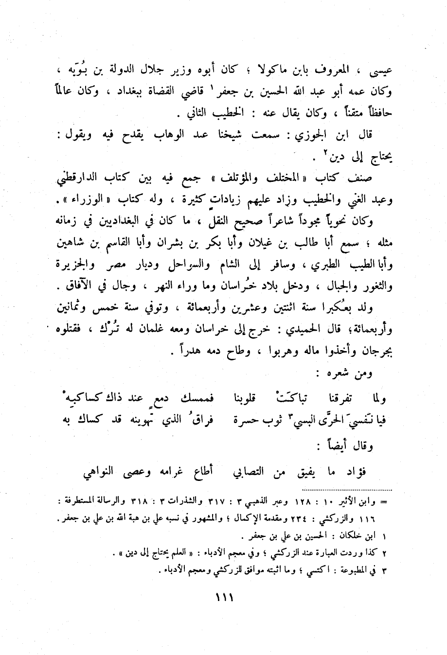 عيسى، المعروف بابن ماكولا؛ كان أبوه وزير جلال الدولة بن بويه، وكان عمه أبو عبد الله الحسين بن جعفر (1) قاضي القضاة ببغداد، وكان عالماً حافظاً متقناً، وكان يقال عنه: الخطيب الثاني.