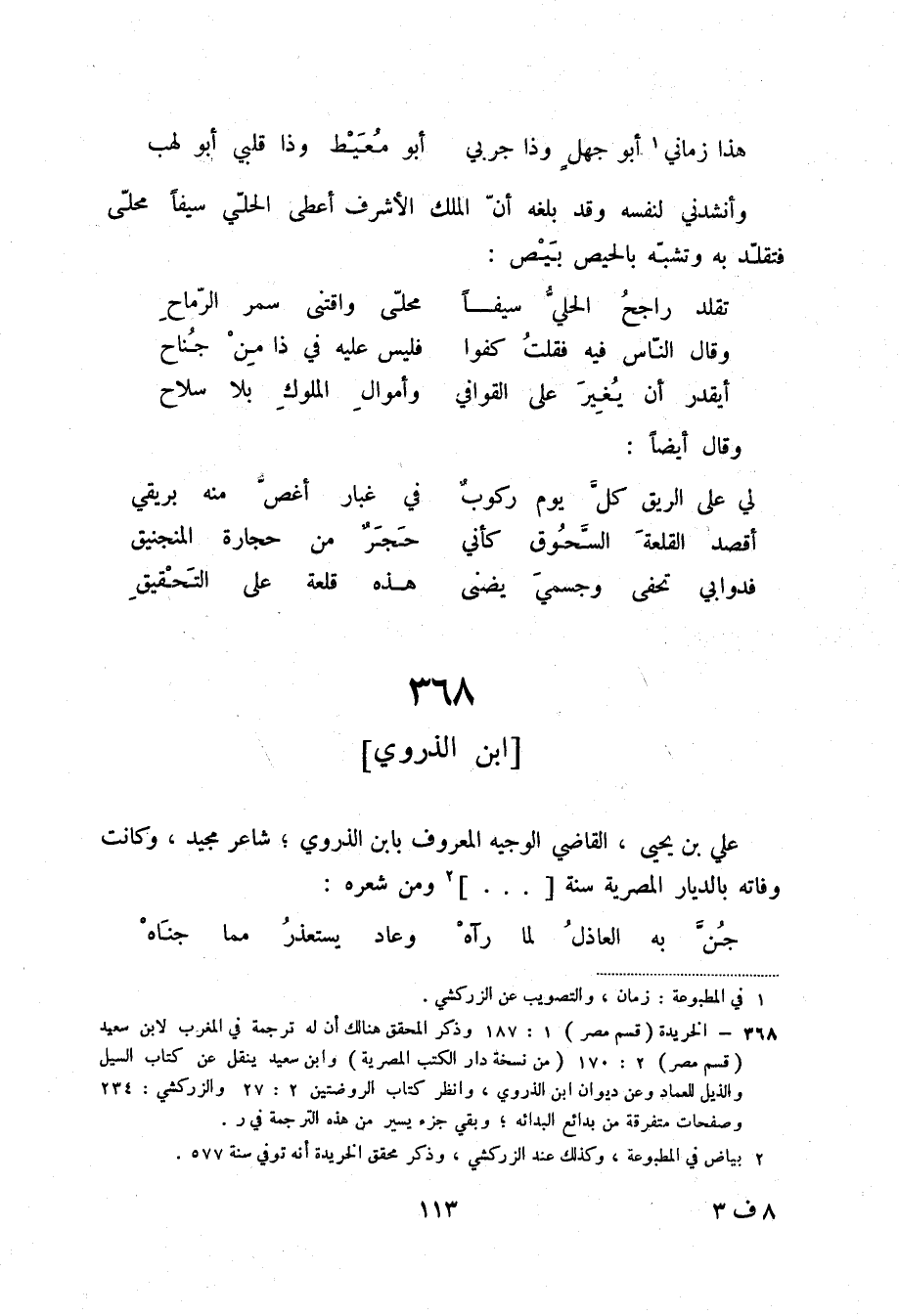 (2) الخريدة (قسم مصر) 1: 187 وذكر المحقق هنالك أن له ترجمة في المغرب لابن سعيد (قسم مصر) 2: 170 (من نسخة دار الكتب المصرية) وابن سعيد ينقل عن كتاب السيل والذيل للعماد وعن ديوان ابن الذروي، وانظر كتاب الروضتين 2: 27 والزركشي: 234 وصفحات متفرقة من بدائع البدائه؛ وبقي جزء يسير من هذه الترجمة في ر.