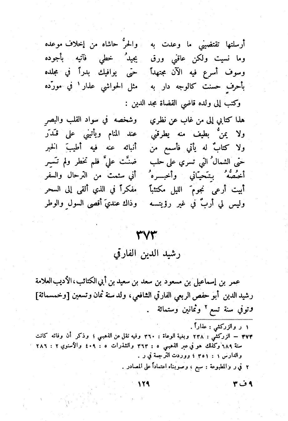 بأحرف حسنت كالوجه دار به ... مثل الحواشي عذار (1) في مورده وكتب إلى ولده قاضي القضاة مجد الدين: