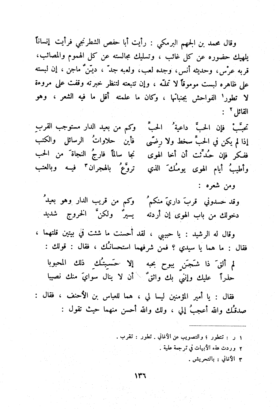 حذراً عليك وإنني بك واثق ... أن لا ينال سواي منك نصيبا فقال: يا أمير المؤمنين ليسا لي، هما للعباس بن الأحنف، فقال: صدقك والله أعجب لي، ولك والله أحسن منهما حيث تقول: