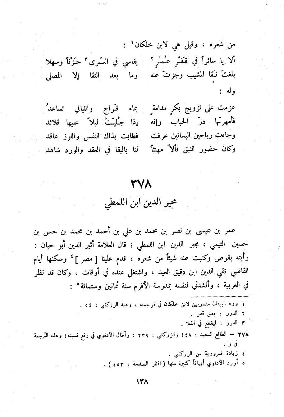 عمر بن عيسى بن نصر بن محمد بن علي بن أحمد بن محمد بن حسن بن حسين التيمي، مجير الدين ابن اللمطي؛ قال العلامة أثير الدين أبو حيان: رأيته بقوص وكتبت عنه شيئاً من شعره، قدم علينا " مصر " (5) وسكنها أيام القاضي تقي الدين ابن دقيق العيد، واشتغل عنده أوقات، وكان قد نظر في العربية، وأنشدني لنفسه بمدرسة الأفرم سنة ثمانين وستمائة (6) :