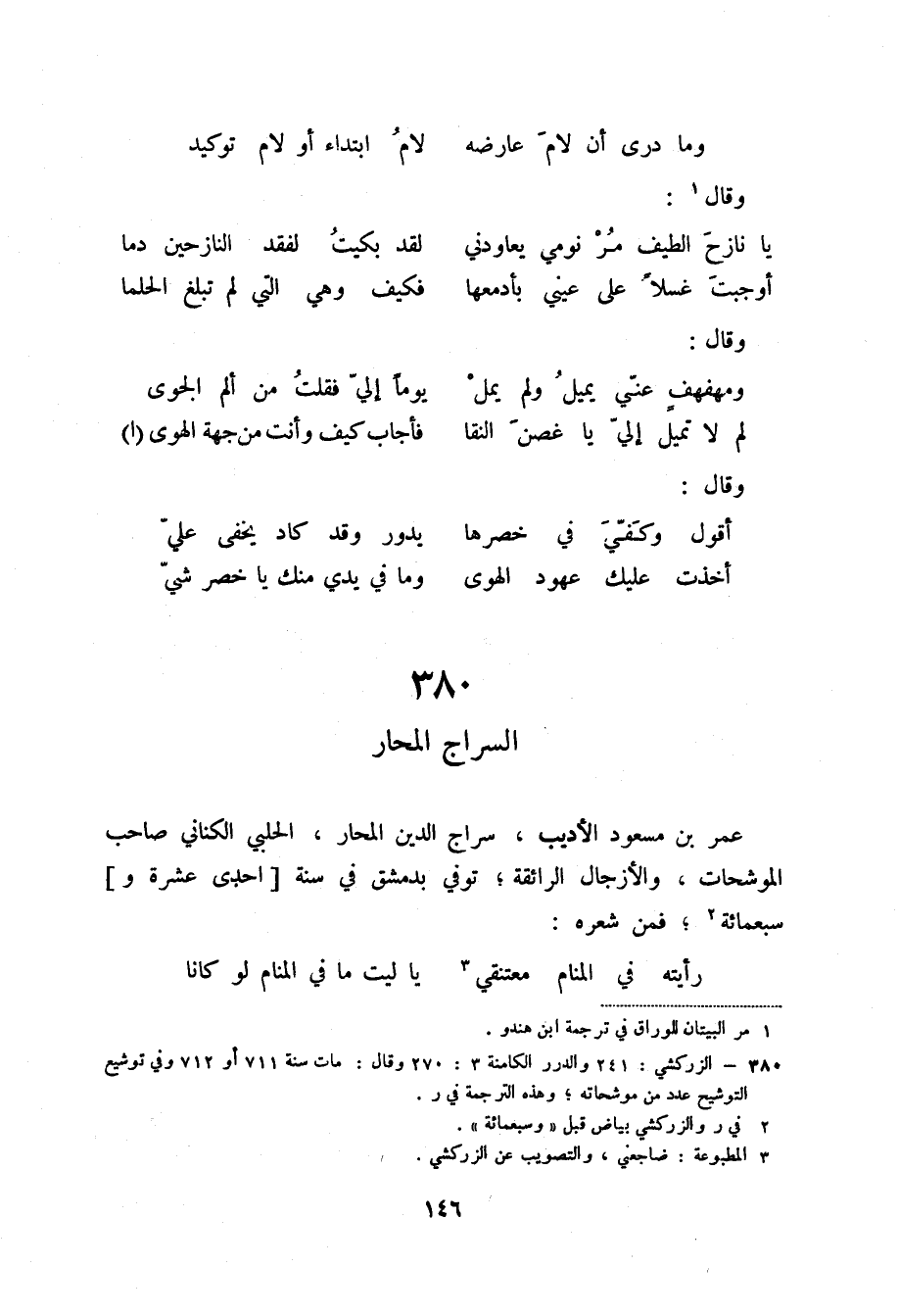 عمر بن مسعود الأديب، سراج الدين المحار، الحلبي الكناني صاحب الموشحات، والأزجال الرائقة؛ توفي بدمشق في سنة " إحدى عشرة و " سبعمائة (3) ؛ فمن شعره:
