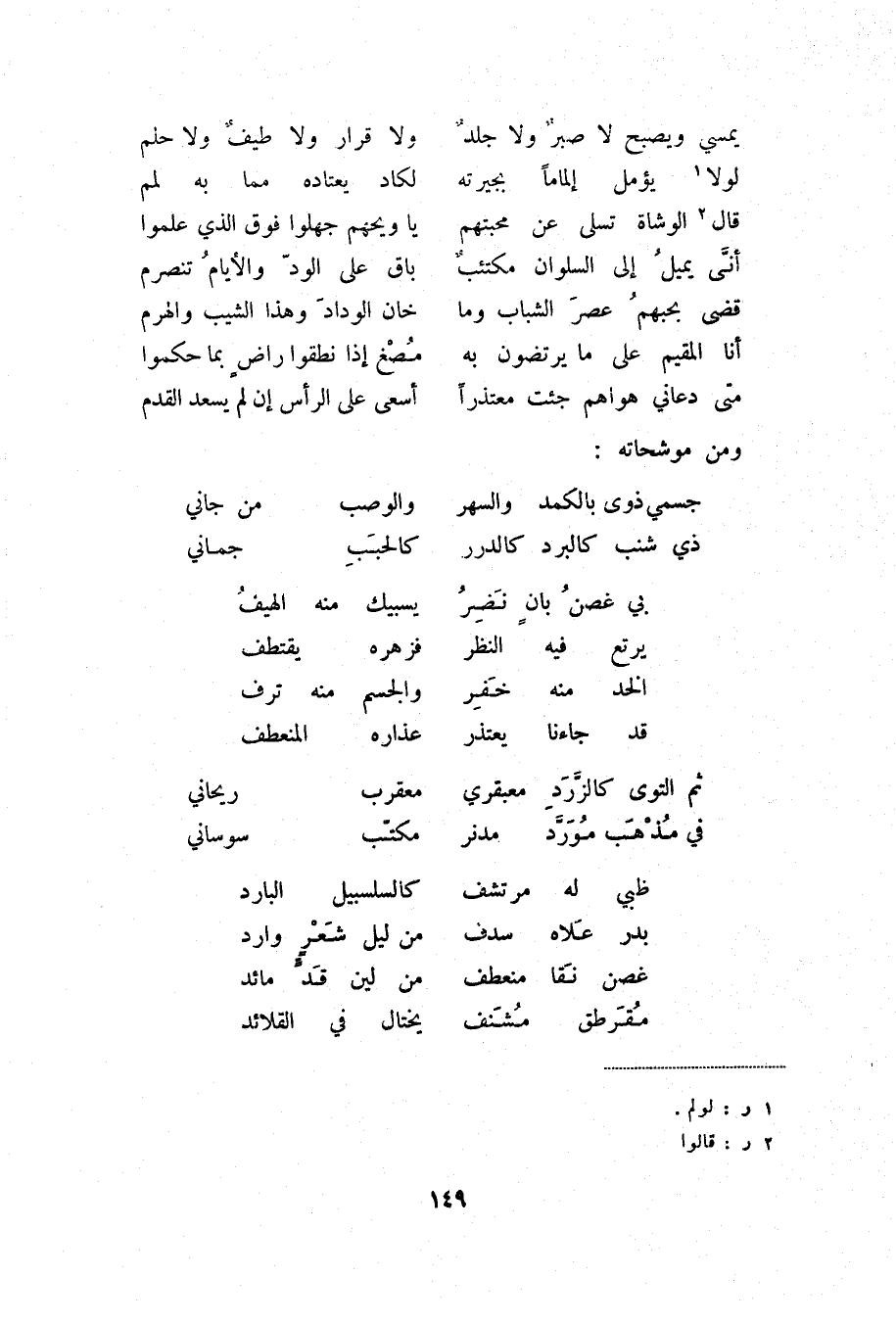 متى دعاني هواهم جئت معتذراً ... أسعى على الرأس إن لم يسعد القدم ومن موشحاته: