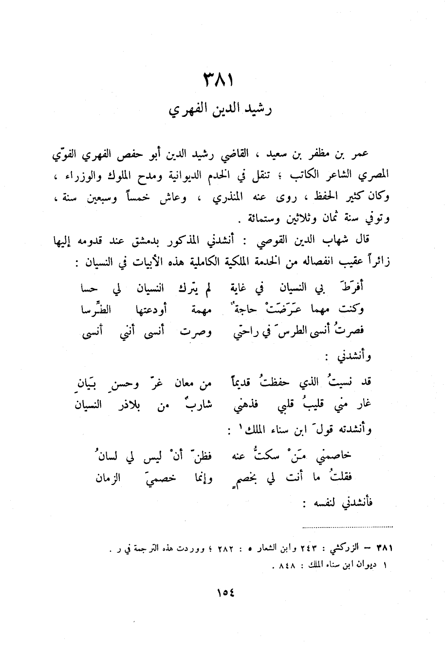 قال شهاب الدين القوصي: أنشدني المذكور بدمشق عند قدومه إليها زائراً عقيب انفصاله من الخدمة الملكية الكاملية هذه الأبيات في النسيان: