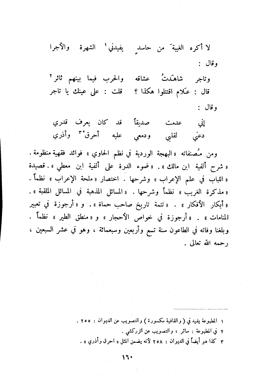 دعني لقلبي ودمعي ... عليه أحرق (3) وأذري ومن مصنفاته " البهجة الوردية في نظم الحاوي " فوائد فقيه منظومة. " شرح ألفية ابن مالك ". " ضوء الدرة على ألفية ابن مطي ". قصيدة " اللباب في علم الإعراب " وشرحها. اختصار " ملحة الإعراب " نظماً. " مذكرة الغريب " نظماً وشرحها. " المسائل المذهبة في المسائل الملقبة ". " أبكار الأفكار ". " تتمة تاريخ صاحب حماة ". و " أرجوزة في تعبير المنامات ". أرجوزة في خواص الأحجار " و " منطق الطير " نظماً. وبلغنا وفاته في الطاعون سنة تسع وأربعين وسبعمائة، وهو في عشر السبعين، رحمه الله تعالى.