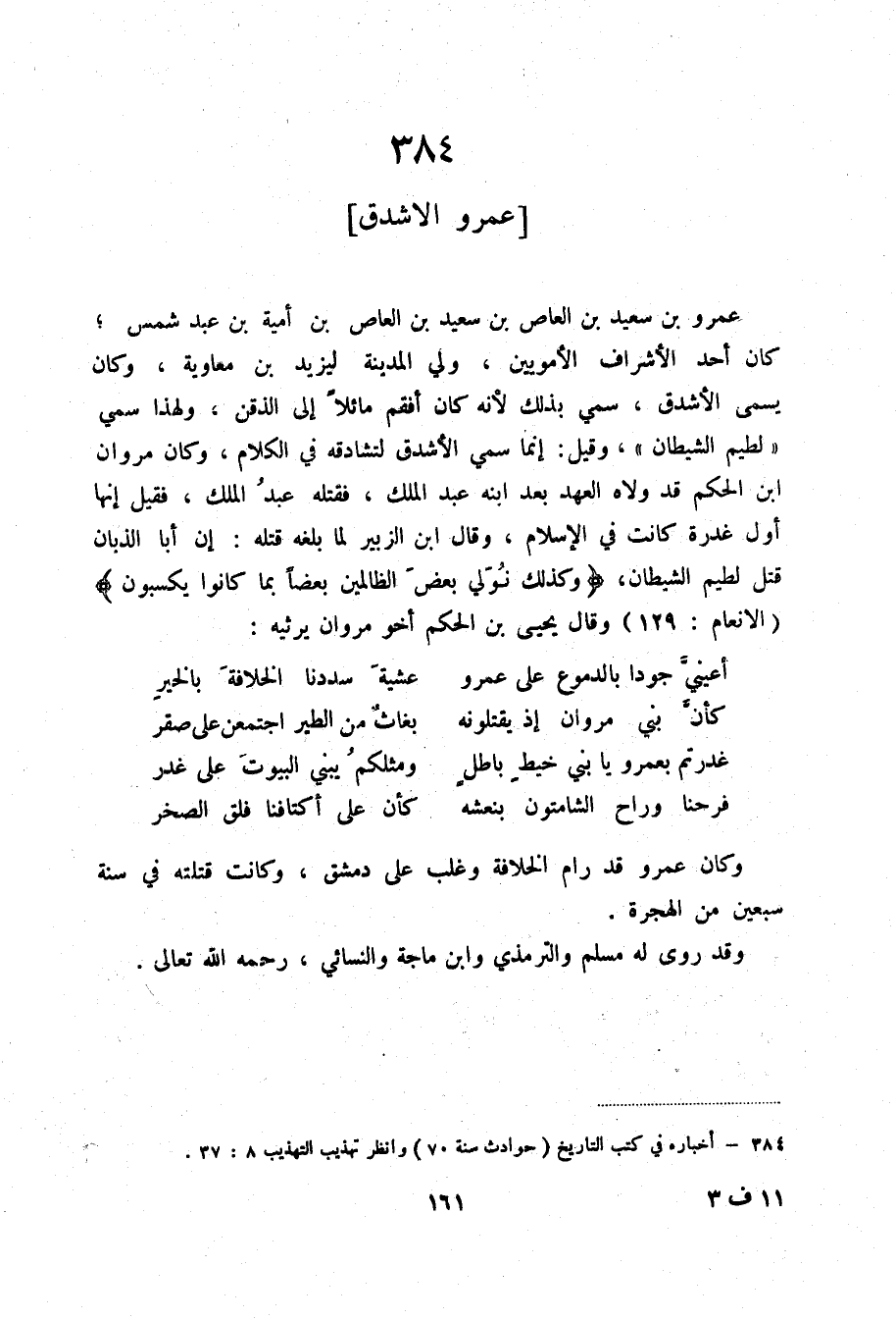 فرحنا وراح الشامتون بنعشه ... كأن على أكتافنا فلق الصخر وكان عمرو قد رام الخلافة وغلب على دمشق، وكانت قتلته في سنة سبعين من الهجرة.