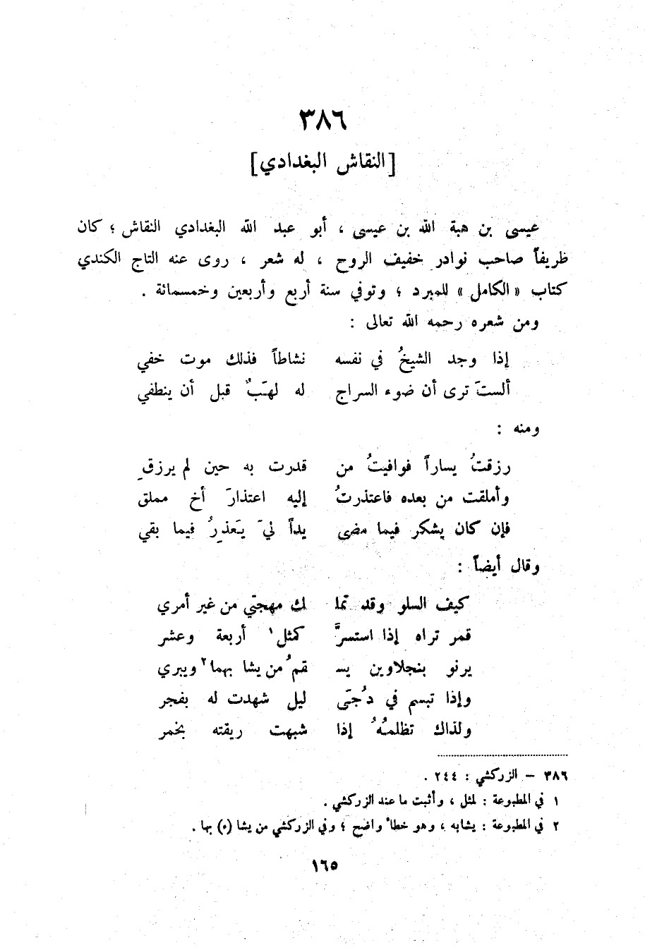 عيسى بن هبة الله بن عيسى، أبو عبد الله البغدادي النقاش؛ كان ظريفاً صاحب نوادر خفيف الروح، له شعر، روى عنه التاج الكندي كتاب " الكامل " للمبرد؛ وتوفي سنة أربع وأربعين وخمسمائة.