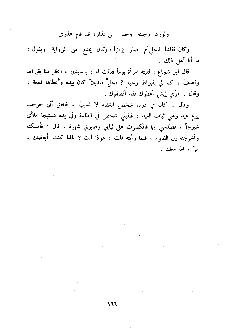 قال ابن شجاع: لقيته امرأة يوماً فقالت له: يا سيدي، النظر منا بقيراط ونصف، كم لي بقيراط وحبة؟ فحل منديلاً كان بيده وأعطاها قطعة، وقال: مري إيش أعطوك فقد أنصفوك.
