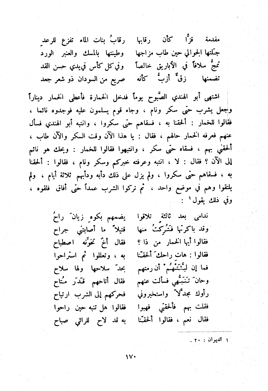تضمنها زق أزب كأنه ... صريع من سودان ذو شعر جعد اشتهى أبو هندي الصبوح يوماً فدخل الخمارة فأعطى الخمار ديناراً وجعل يشرب حتى سكر ونام، وجاء قوم يسلمون عليه فوجدوه نائماً، فقالوا للخمار: ألحقنا به، فسقاهم حتى سكروا، وانتبه أبو الهندي فسأل عنهم فعرفه الخمار حالهم، فقال: يا هذا الآن وقت السكر والآن طاب، ألحقني بهم، فسقاه حتى سكر، وانتبهوا فقالوا للخمار: ويحك هو نائم إلى الآن؟ فقال: لا، انتبه وعرفته خبركم وسكر ونام، فقالوا ألحقنا به، فسقاهم حتى سكروا، ولم يزل على ذلك دأبه ودأبهم ثلاثة أيام، ولم يلتقوا وهم في موضع واحد، ثم تركوا الشرب عمداً حتى أفاق فلقوه، وفي ذلك يقول (1) :