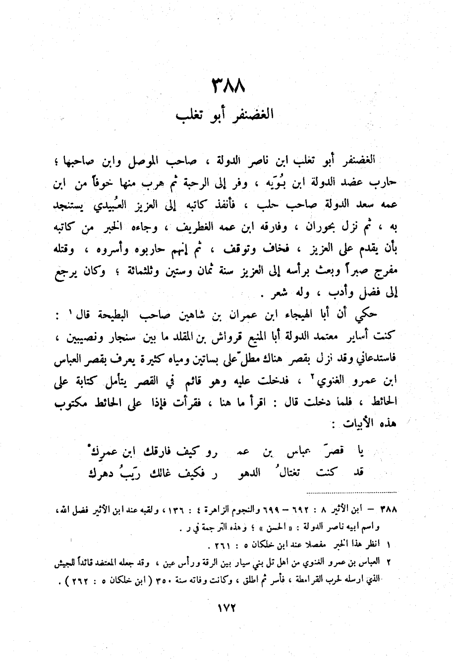 حكي أنا أبا الهيجاء ابن عمران بن شاهين صاحب البطيحة قال (2) : كنت أساير معتمد الدولة أبا المنيع قرواش بن المقلد ما بين سنجار ونصيبين، فاستدعاني وقد نزل يقصر هناك مطل على بساتين ومياه كثيرة يعرف بقصر العباس ابن عمرو الغنوي (3) ، فدخلت عليه وهو قائم في القصر يتأمل كتابة على الحائط، فلما دخلت قال: اقرأ ما هنا، فقرأت فإذا على الحائط مكتوب هذه الأبيات:
