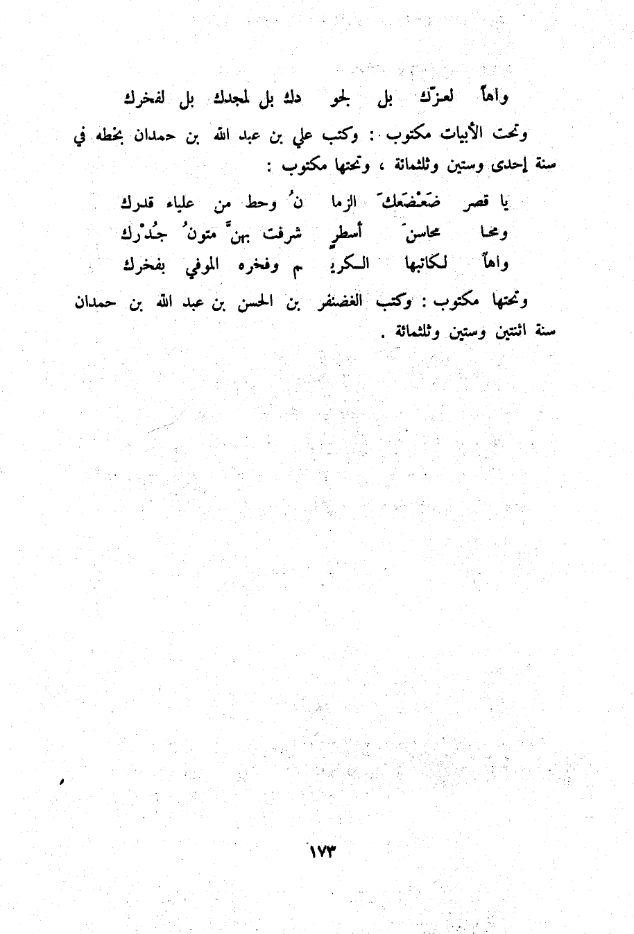 واهاً لعزك بل لجو ... دك بل لمجدك بل لفخرك وتحت الأبيات مكتوب: وكتب علي بن عبد الله بن حمدان بخطه في سنة إحدى وستين وثلاثمائة، وتحتها مكتوب: