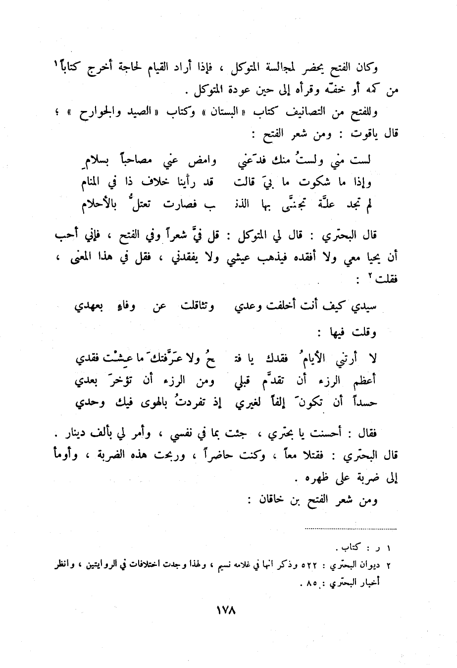 وللفتح من التصانيف كتاب " البستان " وكتاب " الصيد والجوارح "؛ قال ياقوت: ومن شعر الفتح: