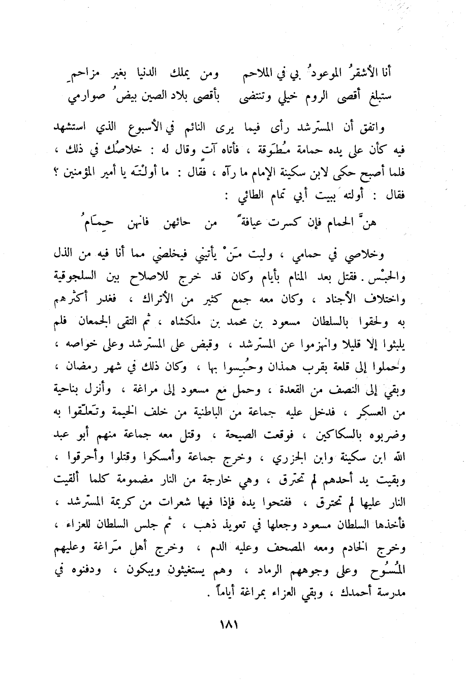 هن الحمام فإن كسرت عيافة ... من حائهن فإنهن حمام وخلاصي في حمامي، وليت من يأتيني فيخلصني مما أنا فيه من الذل والحبس. فقتل بعد المنام بأيام وكان قد خرج للإصلاح بين السلجوقية واختلاف الأجناد، وكان معه جمع كثير من الأتراك، فغدر أكثرهم به ولحقوا بالسلطان مسعود بن محمد بن ملكشاه، ثم التقى الجمعان فلم يلبثوا إلا قليلاً وانهزموا عن المسترشد، وقبض على المسترشد وعلى خواصه، وحملوا إلى قلعة بقرب همذان وحبسوا بها، وكان ذلك في شهر رمضان، وبقي إلى النصف من القعدة، وحمل مع مسعود إلى مراغة، وأنزل بناحية من العسكر، فدخل عليه جماعة من الباطنية من خلف الخيمة وتعلقوا به وضربوه بالسكاكين، فوقعت الصيحة، وقتل معه جماعة منهم أبو عبد الله ابن سكينة وابن الجزري، وخرج جماعة وأمسكوا وقتلوا وحرقوا، وبقيت يد أحدهم لم تحترق، ففتحوا يده فإذا فيها شعرات من كريمة المسترشد، فأخذها السلطان مسعود وجعلها في تعويذ ذهب، ثم جلس السلطان للعزاء، وخرج الخادم ومعه المصحف وعليه الدم، وخرج أهل مراغة وعليهم المسوح وعلى وجوههم الرماد، وهم يستغيثون ويبكون، ودفنوه في مدرسة أحمدك، وبقي العزاء بمراغة أياماً.