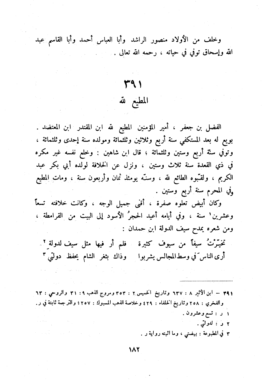 الفضل بن جعفر، أمير المؤمنين المطيع لله ابن المقتدر ابن المعتضد. بويع له بعد المستكفي سنة أربع وثلاثين وثلاثمائة ومولده سنة إحدى وثلاثمائة، وتوفي سنة أربع وستين وثلاثمائة؛ قال ابن شاهين: وخلع نفسه غير مكره في ذي القعدة سنة ثلاث وستين، ونزل عن الخلافة لولده أبي بكر عبد الكريم، ولقبوه الطائع لله، وسنه يومئذ ثمان وأربعون سنة، ومات المطيع وفي المحرم سنة أربع وستين.