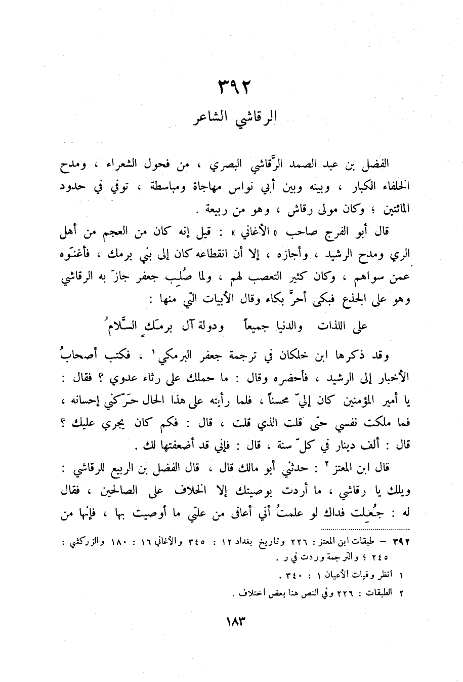 قال ابن المعتز (3) : حدثني أبو مالك قال، قال الفضل بن الربيع للرقاشي: ويلك يا رقاشي، ما أردت بوصيتك إلا الخلاف على الصالحين، فقال له: جعلت فداك لو علمت أني أعافى من علتي ما أوصيت بها، فإنها من