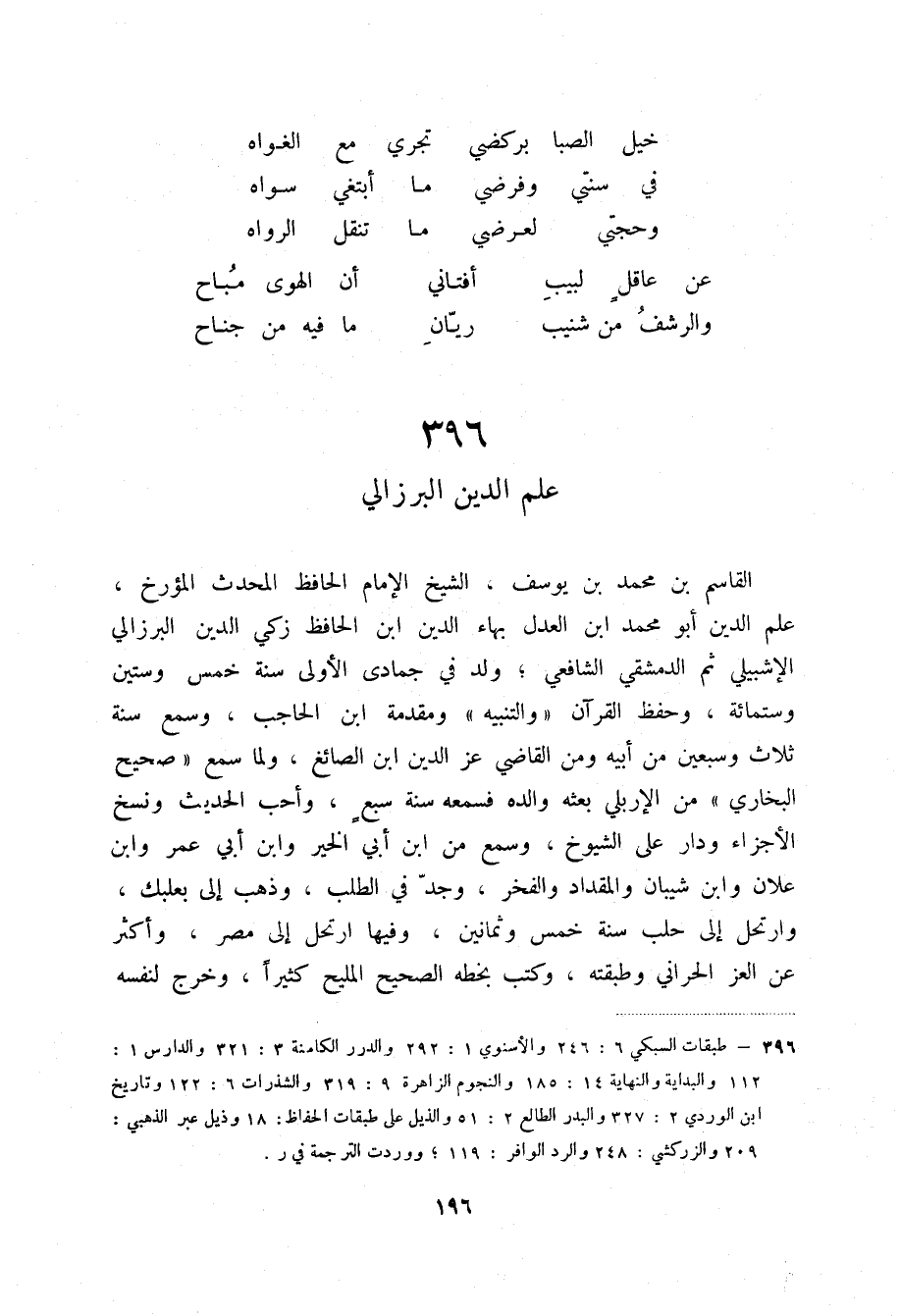 القاسم بن محمد بن يوسف، الشيخ الإمام الحافظ المحدث المؤرخ، علم الدين أبو محمد ابن العدل بهاء الدين ابن الحافظ زكي الدين البرزالي الإشبيلي ثم الدمشقي الشافعي؛ ولد في جمادى الأولى سنة خمس وستين وستمائة، وحفظ القرآن " والتنبيه " ومقدمة ابن الحاجب، وسمع سنة ثلاث وسبعين من أبيه ومن القاضي عز الدين ابن الصائغ، ولما سمع " صحيح البخاري " من الإربلي بعثه والده فسمعه سنة سبع، وأحب الحديث ونسخ الأجزاء ودار على الشيوخ، وسمع من ابن أبي الخير وابن أبي عمر وابن علان وابن شيبان والمقداد والفخر، وجد في الطلب، وذهب إلى بعلبك، وارتحل إلى حلب سنة خمس وثمانين، وفيها ارتحل إلى مصر، وأكثر عن العز الحراني وطبقته، وكتب بخطه الصحيح المليح كثيراً وخرج لنفسه