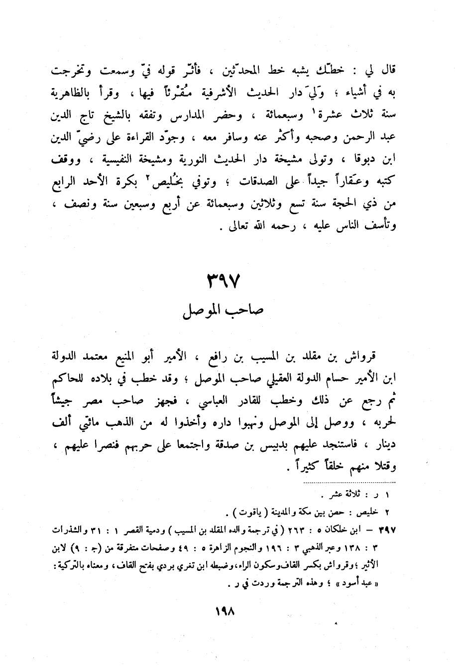 (3) ابن خلكان 5: 263 (في ترجمةوالده المقلد بن المسيب) ودمية القصر 1: 31 والشذرات الأثير؛ وقرواش بكسر القاف وسكون الراء، وضبطه ابن تغري بردي بفتح القاف، ومعناه بالتركية: ((عبد أسود)) ؛ وهذه الترجمة وردت في ر.