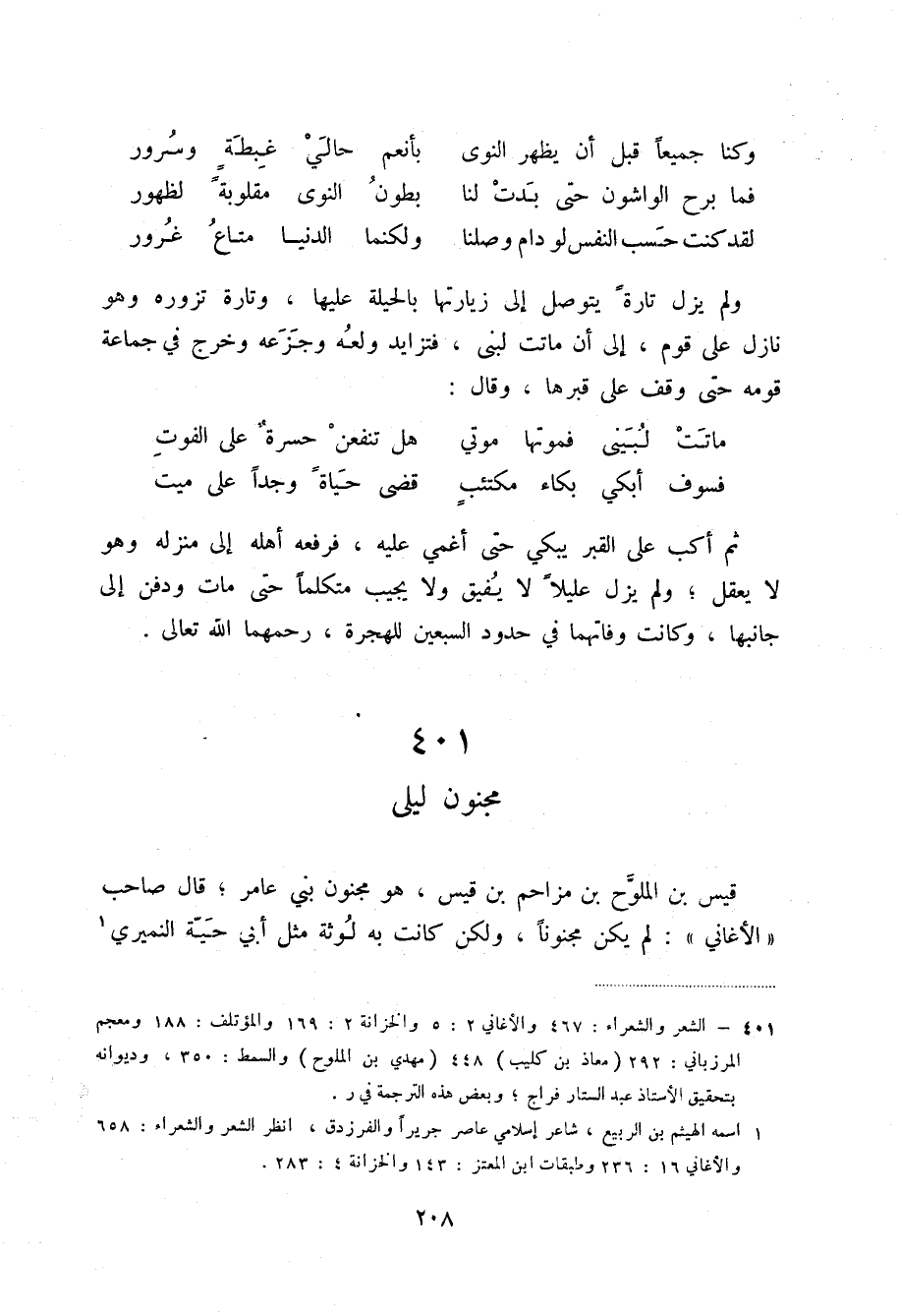 لقد كنت حسب النفس لو دام وصلنا ... ولكنما الدنيا متاع غرور ولم يزل تارة يتوصل إلى زيارتها بالحيلة عليها، وتارة تزوره وهو نازل على قوم، إلى أن ماتت لبنى، فتزايد ولعه وجزعه وخرج في جماعة قومه حتى وقف على قبرها، وقال: