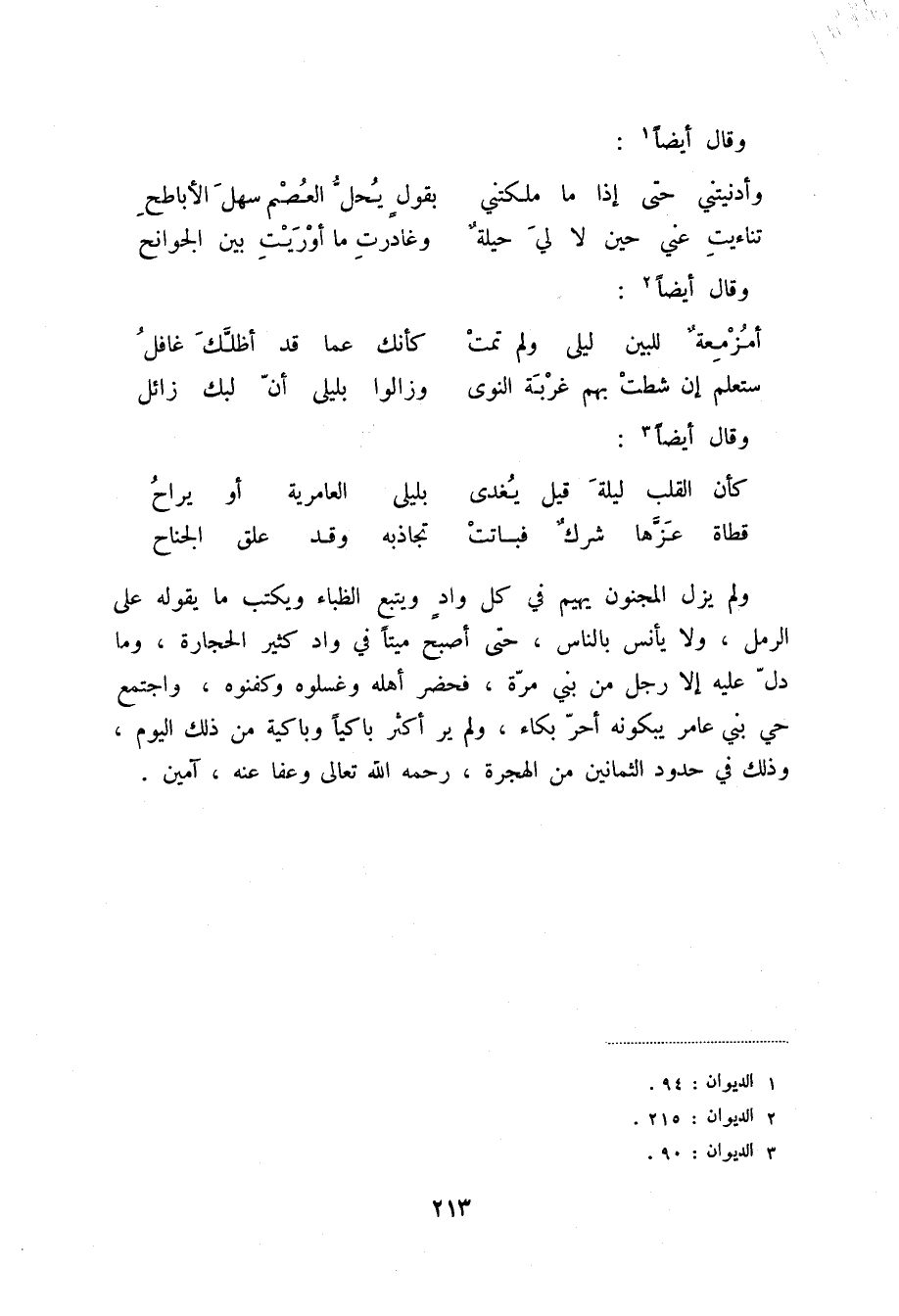 قطاه عزها شرك فباتت ... تجاذبه وقد علق الجناح ولم يزل المجنون يهيم في كل واد ويتبع الظباء ويكتب ما يقوله على الرمل، ولا يأنس بالناس، حتى أصبح ميتاً في واد كثير الحجارة، وما دل عليه إلا رجل من بني مرة، فحضر أهله وغسلوه وكفنوه، واجتمع حي بني عامر يبكونه أحر بكاء، ولم ير أكثر باكياً وباكية من ذلك اليوم، وذلك في حدود الثمانين من الهجرة، رحمه الله تعالى وعفا عنه، آمين.