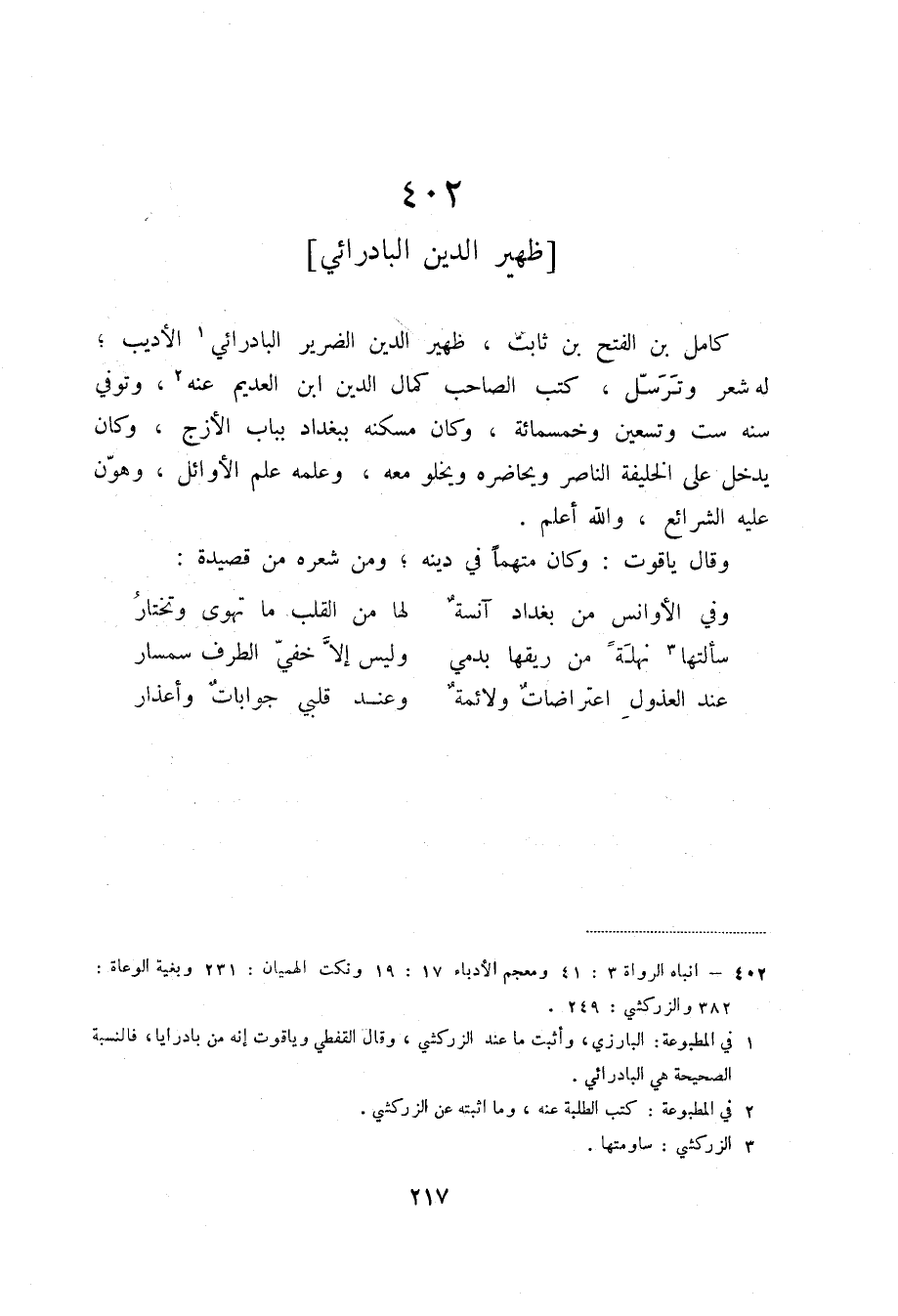 (2) في المطبوعة: البارزي، وأثبت ما عند الزركشي، وقال القفطي وياقوت إنه من بادرايا، فالنسبة الصحيحة هي البادرائي.
