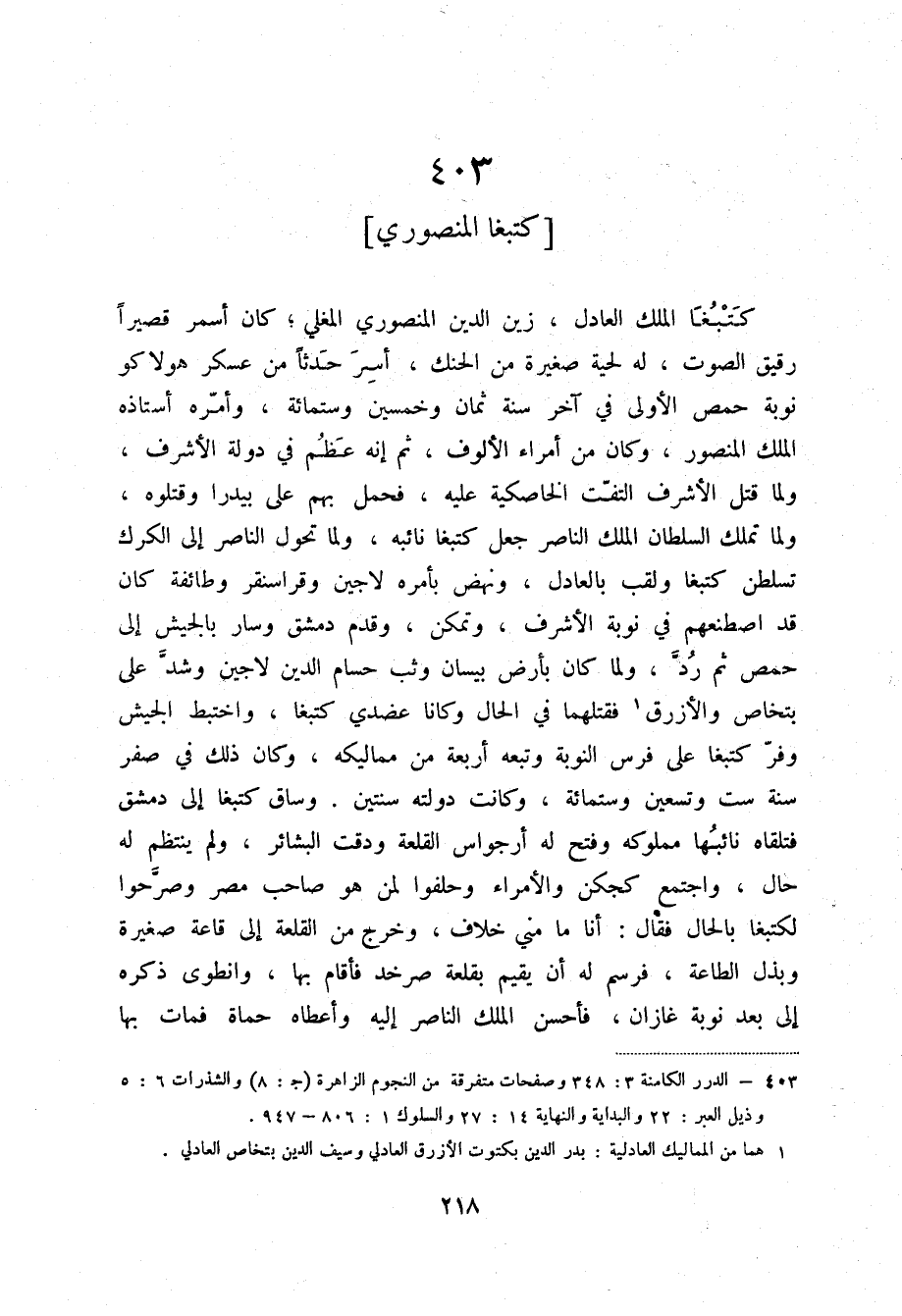 كتبغا الملك العادل، زين الدين المنصوري المغلي؛ كان أسمر قصيراً رقيق الصوت، له لحية صغيرة من الحنك، أسر حدثاً من عسكر هولاكو نوبة حمص الأولى في آخر سنة ثمان وخمسين وستمائة، وأمره أستاذه الملك المنصور، وكان من أمراء الألوف، ثم إنه عظم في دولة الأشرف، ولما قتل الأشرف التفت الخاصكية عليه، فحمل بهم على بيدرا وقتلوه، ولما تملك السلطان الملك الناصر جعل كتبغا نائبه، ولما تحول الناصر إلى الكرك تسلطن كتبغا ولقب بالعادل، ونهض بأمره لاجين وقراسنقر وطائفة كان قد اصطنعهم في نوبة الأشرف، وتمكن، وقدم دمشق وسار بالجيش إلى حمص ثم رد، ولما كان بأرض بيسان وثب حسام الدين لاجين وشد على بتخاص والأزرق (2) فقتلهما في الحال وكانا عضدي كتبغا، واختبط الجيش وفر كتبغا على فرس النوبة وتبعه أربعة من مماليكه، وساق كتبغا إلى دمشق فتلقاه نائبها مملوكه وفتح له أرجواس القلعة ودقت البشائر، ولم ينتظم له حال، واجتمع كجكن والأمراء وحلفوا لمن هو صاحب مصر وصرحوا لكتبغا في الحال فقال: أنا ما مني خلاف، وخرج من القلعة إلى قاعة صغيرة وبذل الطاعة، فرسم له أن يقيم بقلعة صرخد فأقام بها، وانطوى ذكره إلى بعد نوبة غازان، فأحسن الملك الناصر إليه وأعطاه حماة فمات بها