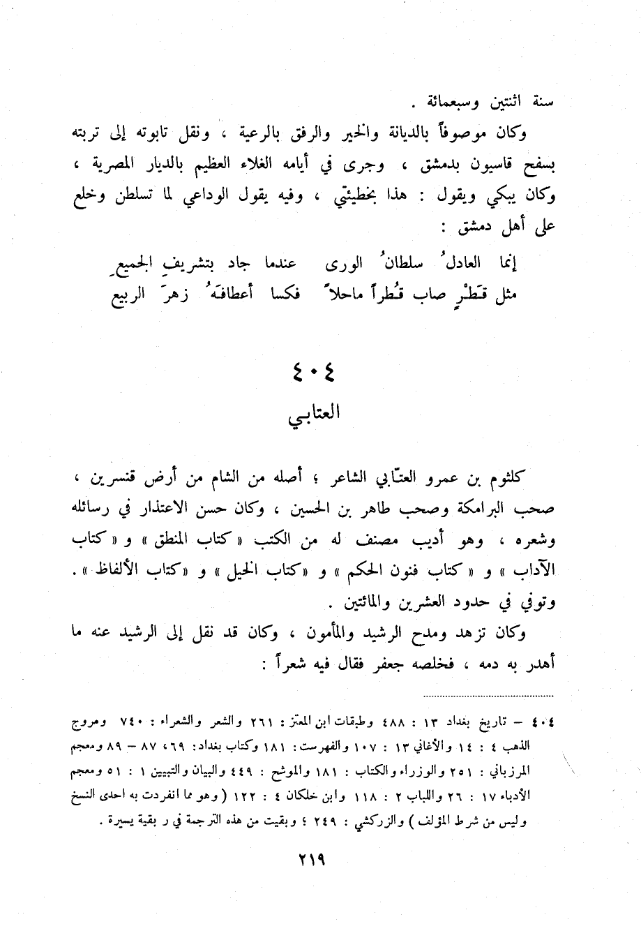 كلثوم بن عمرو العتابي الشاعر؛ أصله من الشام من أرض قنسرين، صحب البرامكة وصحب طاهر بن الحسين، وكان حسن الاعتذار في رسائله وشعره، وهو أديب مصنف له من الكتب " كتاب المنطق " و " كتاب الآداب " و " كتاب فنون الحكم " و " كتاب الخيل " و " كتاب الألفاظ ". وتوفي في حدود العشرين والمائتين.