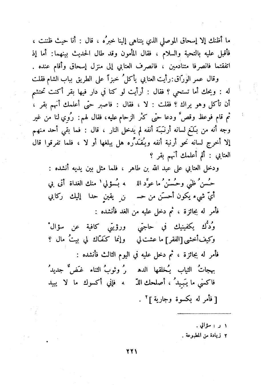 ودخل العتابي على عبد الله بن طاهر، فلما مثل بين يديه أنشده: