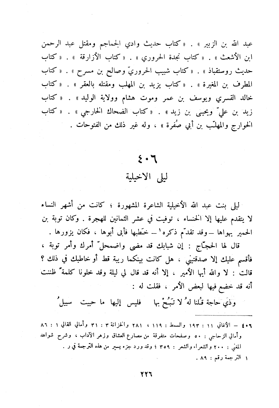 ليلى بنت عبد الله الأخيلية الشاعرة المشهورة؛ كانت من أشهر النساء لا يتقدم عليها إلا الخنساء، توفيت في عشر الثمانين للهجرة. وكان توبة بن الحمير يهواها - وقد نقدم ذكره (2) خطبها فأبى أبوها، فكان يزورها.