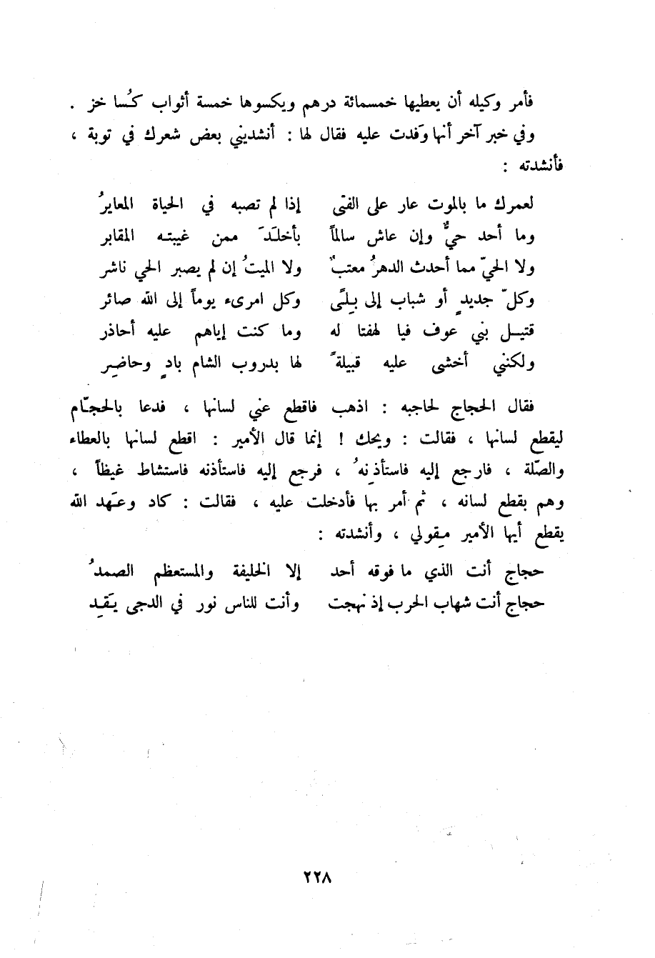ولكنني أخشى عليه قبيلة ... لها بدروب الشام باد وحاضر فقال الحجاج لحاجبه: اذهب فاقطع عني لسانها، فدعا بالحجام ليقطع لسانها، فقالت: ويحك! إنما قال الأمير: اقطع لسانها بالعطاء والصلة، فارجع إليه فاستأذنه، فرجع إليه فاستأذنه فاستشاط غيظاً، وهم بقطع لسانه، ثم أمر بها فأدخلت عليه، فقالت: كاد وعهد الله يقطع أيها الأمير مقولي، وأنشدته: