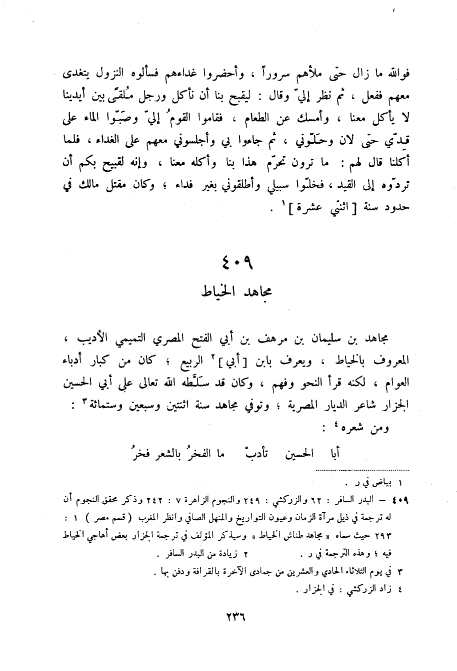 (2) البدر السافر: 62 والزركشي: 249 والنجوم الزاهرة 7: 242 وذكر محقق النجوم أن له ترجمة في ذيل مرآة الزمان وعيون التواريخ والمنهل الصافي وانظر المغرب (قسم مصر) 1: 293 حيث سماه ((مجاهد طناش الخياط)) وسيذكر المؤلف في ترجمة الجزار بعض أهاجي الخياط فيه؛ وهذه الترجمة في ر.