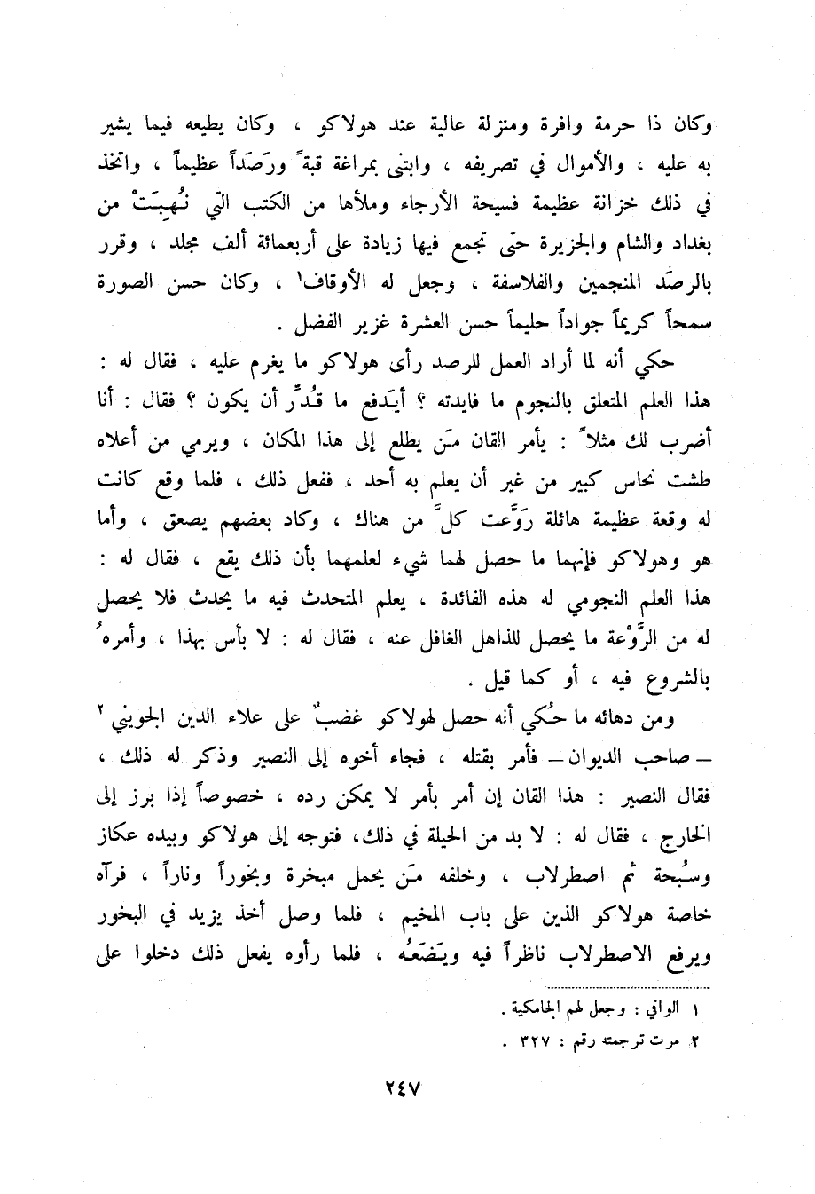 وكان ذا حرمة وافرة ومنزلة عالية عند هولاكو، وكان يطيعه فيما يشير به عليه، والأموال في تصريفه، وابتنى بمراغة قبة ورصداً عظيماً، واتخذ في ذلك خزانة عظيمة فسيحة الأرجاء وملأها من الكتب التي نهبت من بغداد والشام والجزيرة حتى تجمع فيها زيادة على أربعمائة ألف مجلد، وقرر بالرصد المنجمين والفلاسفة، وجعل له الأوقاف (1) ، وكان حسن الصورة سمحاً كريماً جواداً حليماً حسن العشرة غزير الفضل.