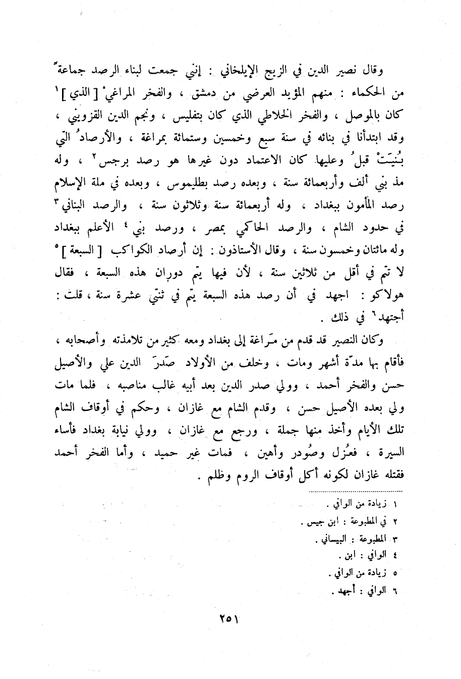 وقال نصير الدين في الزيج الإيلخاني: أنني جمعت لبناء الرصد جماعة من الحكماء: منهم المؤيد العرضي من دمشق، والفخر المراغي " الذي " (1) كان بالموصل، والفخر الخلاطي الذي كان بتفليس، ونجم الدين القزويني، وقد ابتدأنا في بنائه في سنة سبع وخمسين وستمائة بمراغة، والأرصاد التي بنيت قبل وعليها كان الاعتماد دون غيرها هو رصد برجس (2) ، وله مذ بني ألف وأربعمائة سنة، وبعده رصد بطليموس، وبعده في ملة الإسلام رصد المأمون ببغداد، وله أربعمائة سنة وثلاثون سنة، والرصد البناني (3) في حدود الشام، والرصد الحاكمي بمصر، ورصد بني (4) الأعلم ببغداد وله مائتان وخمسون سنة، وقال الأستاذون: إن أرصاد الكواكب " السبعة " (5) لا تتم في أقل من ثلاثين سنة، لأن فيها يتم دوران هذه السبعة، فقال هولاكو: اجهد في أن رصد هذه السبعة يتم في اثنتي عشرة سنة، قلت: أجتهد (6) في ذلك.
