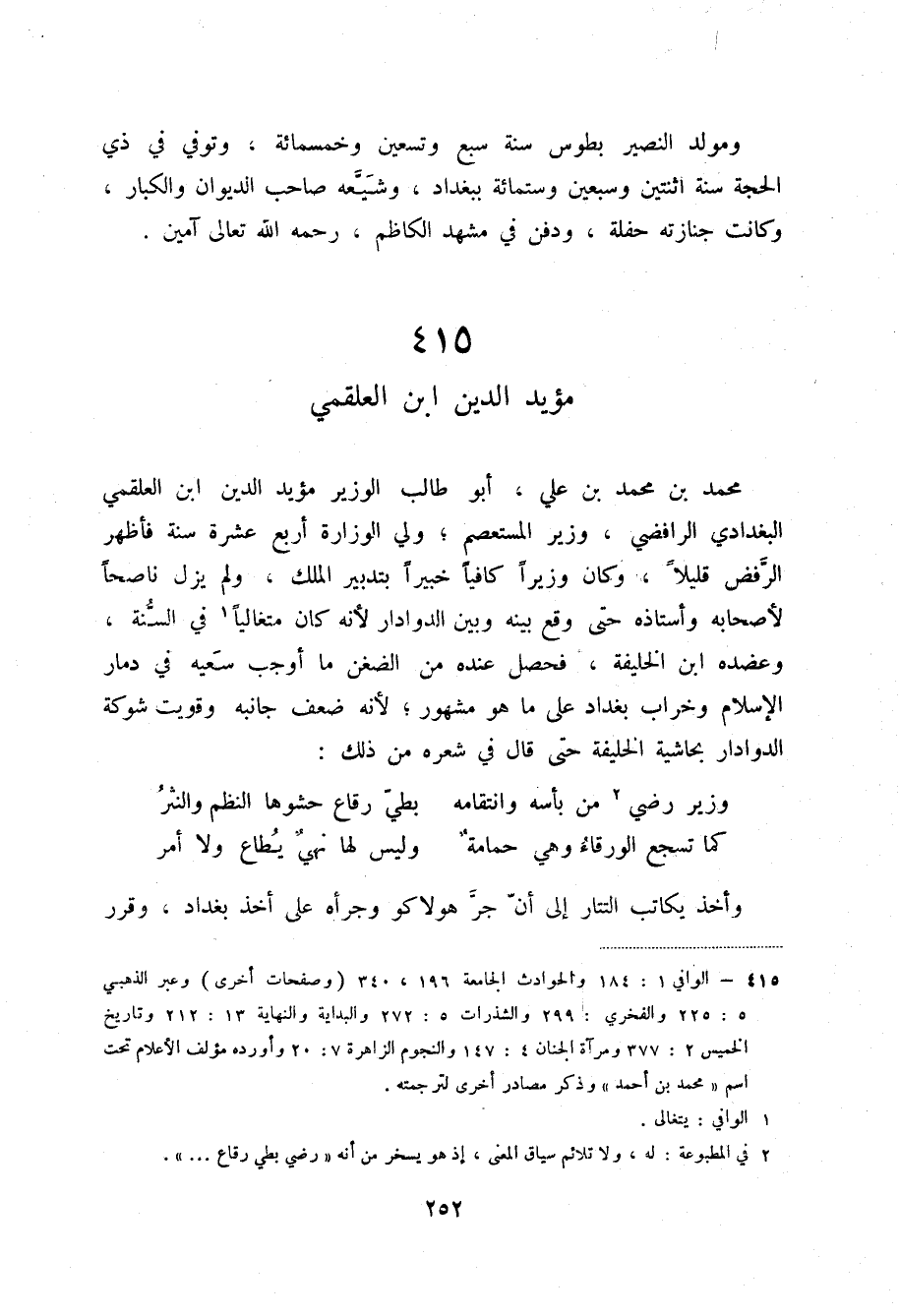 محمد بن محمد بن علي، أبو طالب الوزير مؤيد الدين ابن العلقمي البغدادي الرافضي، وزير المستعصم؛ ولي الوزارة أربع عشرة سنة فأظهر الرفض قليلاً، وكان وزيراً كافياً خبيراً بتدبير الملك، ولم يزل ناصحاً لأصحابه وأستاذه حتى وقع بينه وبين الدوادار لأنه كان متغالياً (2) في السنة، وعضده ابن الخليفة، فحصل عنده من الضغن ما أوجب سعيه في دمار الإسلام وخراب بغداد على ما هو مشهور؛ لأنه ضعف جانبه وقويت شوكة الدوادار بحاشية الخليفة حتى قال في شعره من ذلك: