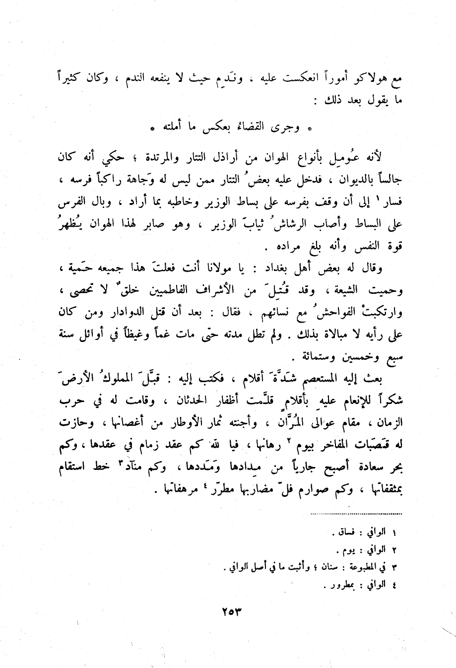 لأنه عومل بأنواع الهوان من أراذل التتار والمرتدة؛ حكي أنه كان جالساً بالديوان، فدخل عليه بعض التتار ممن ليس له وجاهة راكباً فرسه، فسار (1) إلى أن وقف بفرسه على بساط الوزير وخاطبه بما أراد، وبال الفرس على البساط وأصاب الرشاش ثياب الوزير، وهو صابر لهذا الهوان يظهر قوة النفس وأنه بلغ مراده.