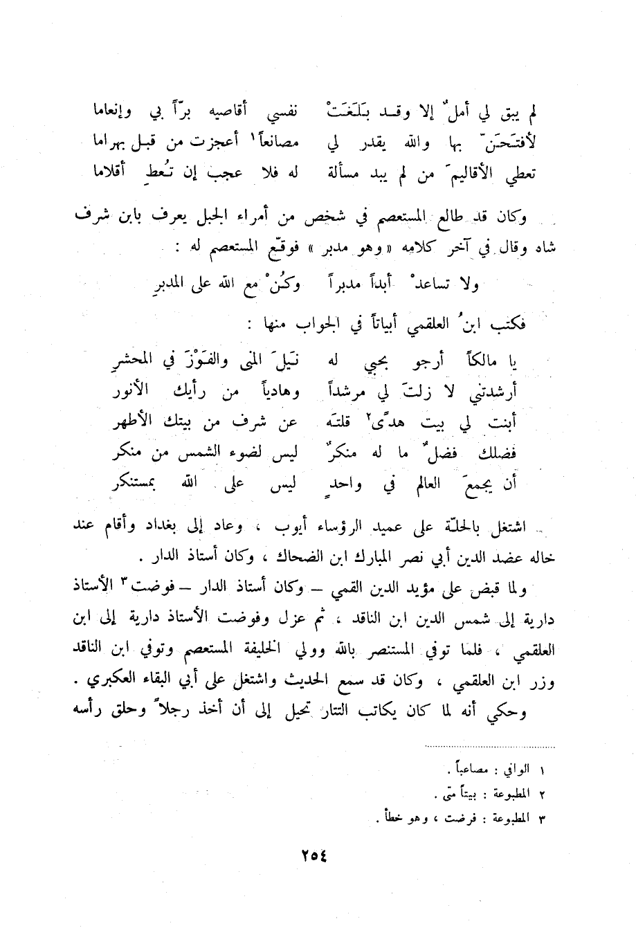 ولا تساعد أبداً مدبراً ... وكن مع الله على المدبر فكتب ابن العلقمي أبياتاً في الجواب منها: