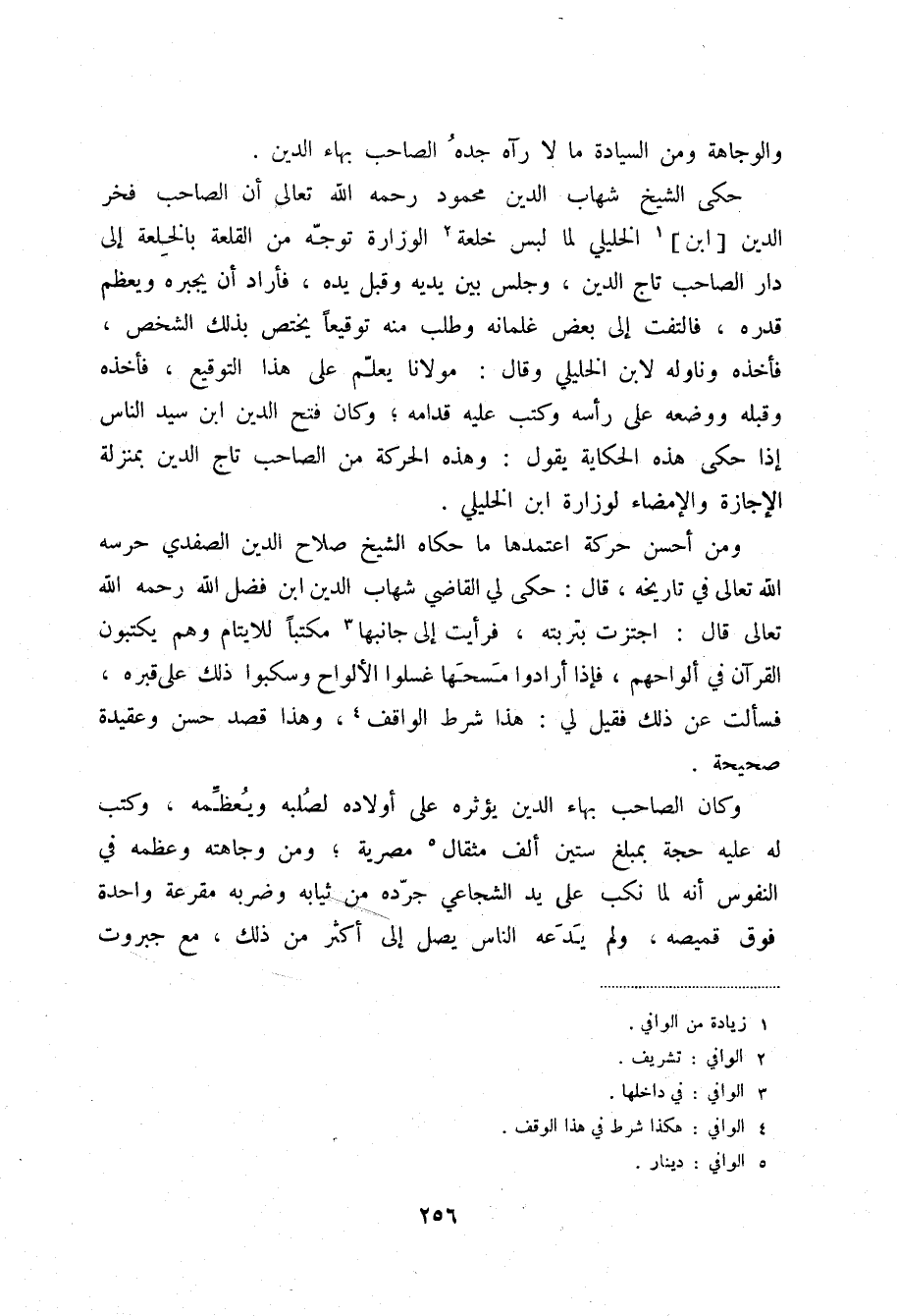 حكى الشيخ شهاب الدين محمود رحمه الله تعالى أن الصاحب فخر الدين " ابن " (1) الخليلي لما لبس خلعة (2) الوزارة توجه من القلعة بالخلعة إلى دار الصاحب تاج الدين، وجلس بين يديه وقبل يده، فأراد أن يجبره ويعظم قدره، فالتفت إلى بعض غلمانه وطلب منه توقيعاً يختص بذلك الشخص، فأخذه وناوله لابن الخليلي وقال: مولانا يعلم على هذا التوقيع، فأخذه وقبله ووضعه على رأسه وكتب عليه قدامه؛ وكان فتح الدين ابن سيد الناس إذا حكى هذه الحكاية يقول: وهذه الحركة من الصاحب تاج الدين بمنزلة الإجازة والإمضاء لوزارة ابن الخليلي.