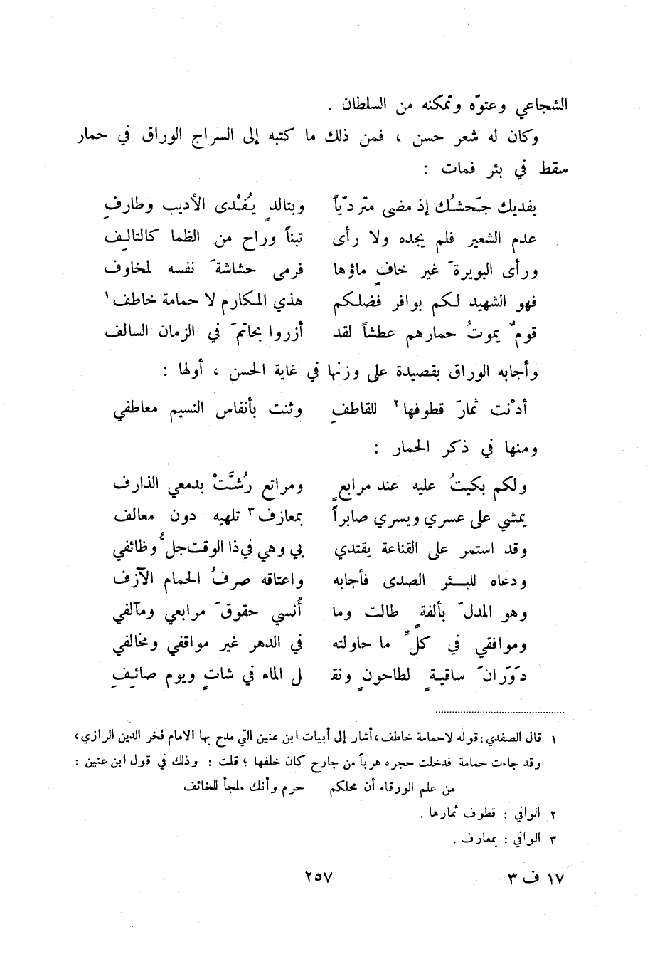 (1) قال الصفدي: قوله لاحمامة خاطف، أشار إلى أبيات ابن عنين التي مدح بها الإمام فخر الدين الرازي، وقد جاءت حمامة فدخلت حجره هرباً من جارح كان خلفها؛ قلت: وذلك في قول ابن عنين: