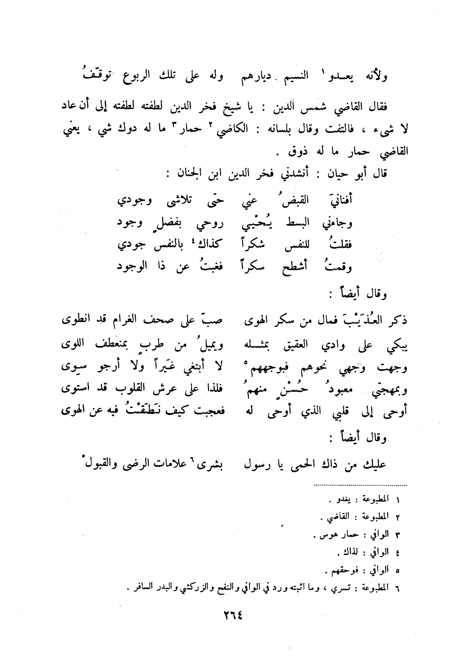 ولأنه يعد (1) والنسيم ديارهم ... وله على تلك الربوع توقف فقال القاضي شمس الدين: يا شيخ فخر الدين لطفته لطفته إلى أن عاد لا شيء، فالتفت وقال بلسانه: الكاضي (2) حمار (3) ما له دوك شيء، يعني القاضي حمار ما له ذوق.