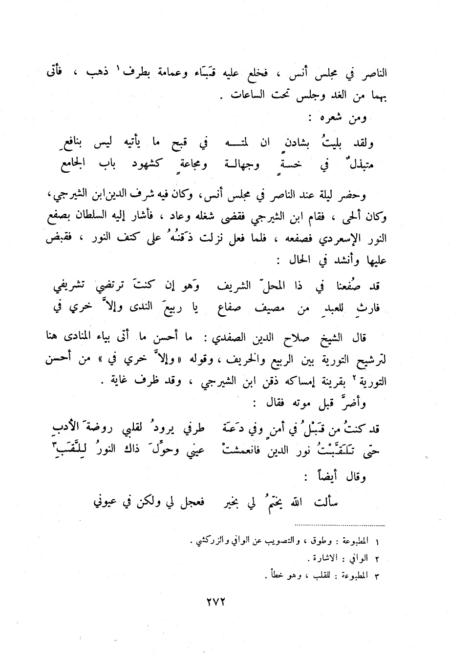 فارث للعبد من مصيف صفاع ... يا ربيع الندى وإلا خري في قال الشيخ صلاح الدين الصفدي: ما أحسن ما أتى بياء المنادى هنا لتشريح التورية بين الربيع والخريف، وقوله " وإلا خري في " من أحسن التورية (2) بقرينة إمساكه ذفن ابن الشيرجي، وقد ظرف غاية.