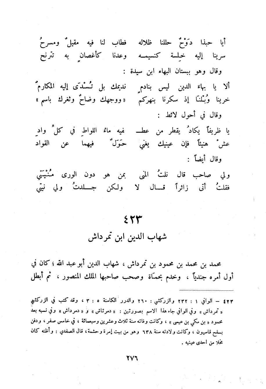 (1) الوافي 1: 232 والزركشي: 260 والدرر الكامنة 5: 3، وقد كتب الزركشي ((تمرداش)) وفي الوافي جاء هذا الاسم بصورتين: ((دمرتاش)) و ((دمرداش)) وفي نسبه بعد محمود ((بن سكي بن عيسى)) ، وكانت وفاته سنة ثلاث وعشرين وسبعمائة، في خامس صفر، ودفن بسفح قاسيون، وكانت ولادته سنة 638 وهو من بيت إمرة وحشمة، قال الصفدي: وأظنه كان مخلا من إحدى عينيه.