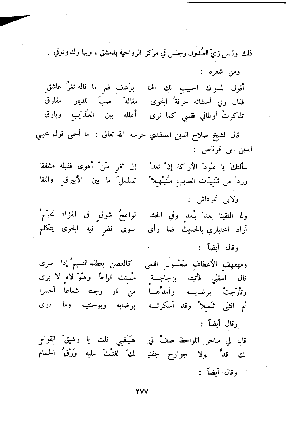 تذكرت أوطاني فقلبي كما ترى ... أعلله بين العذيب وبارق قال الشيخ صلاح الدين الصفدي حرسه الله تعالى: ما أحلى قول محيي الدين ابن قرناص: