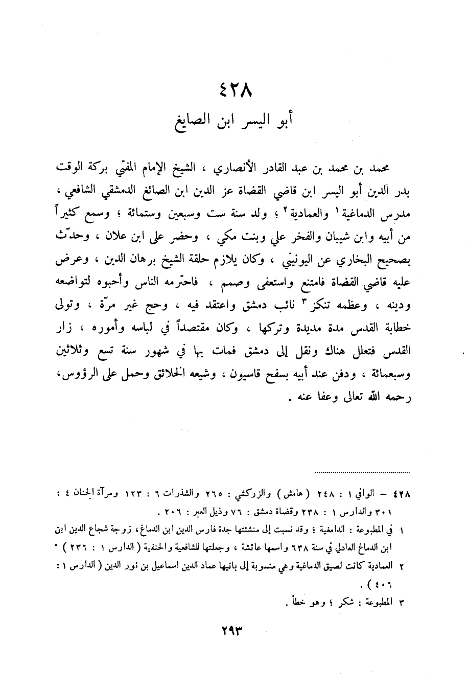 محمد بن محمد بن عبد القادر الأنصاري، الشيخ الإمام المفتي بركة الوقت بدر الدين أبو اليسر ابن قاضي القضاة عز الدين ابن الصايغ الدمشقي الشافعي، مدرس الدماغية (2) والعمادية (3) ؛ ولد سنة ست وسبعين وستمائة؛ وسمع كثيراً من أبيه وابن شيبان والفخر علي وبنت مكي، وحضر على ابن علان، وحدث بصحيح البخاري عن اليونيني، وكان يلازم حلقة الشيخ برهان الدين، وعرض عليه قاضي القضاة فامتنع واستعفى وصمم، فاحترمه الناس وأحبوه لتواضعه ودينه، وعظمه تنكز (4) نائب دمشق واعتقد فيه، وحج غير مرة، وتولى خطابة القدس مدة مديدة وتركها، وكان مقتصداً في لباسه وأموره، زار القدس فتعلل هناك ونقل إلى دمشق فمات بها شهور سنة تسع وثلاثين وسبعمائة، ودفن عند أبيه بسفح قاسيون، وشيعه الخلائق وحمل على الرؤوس، رحمه الله تعالى وعفا عنه.